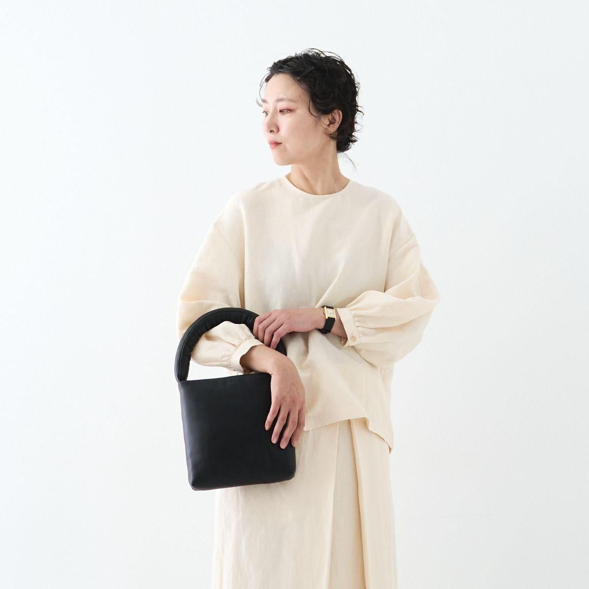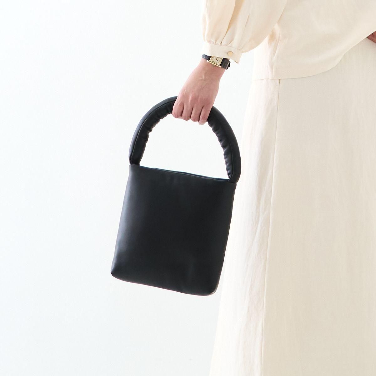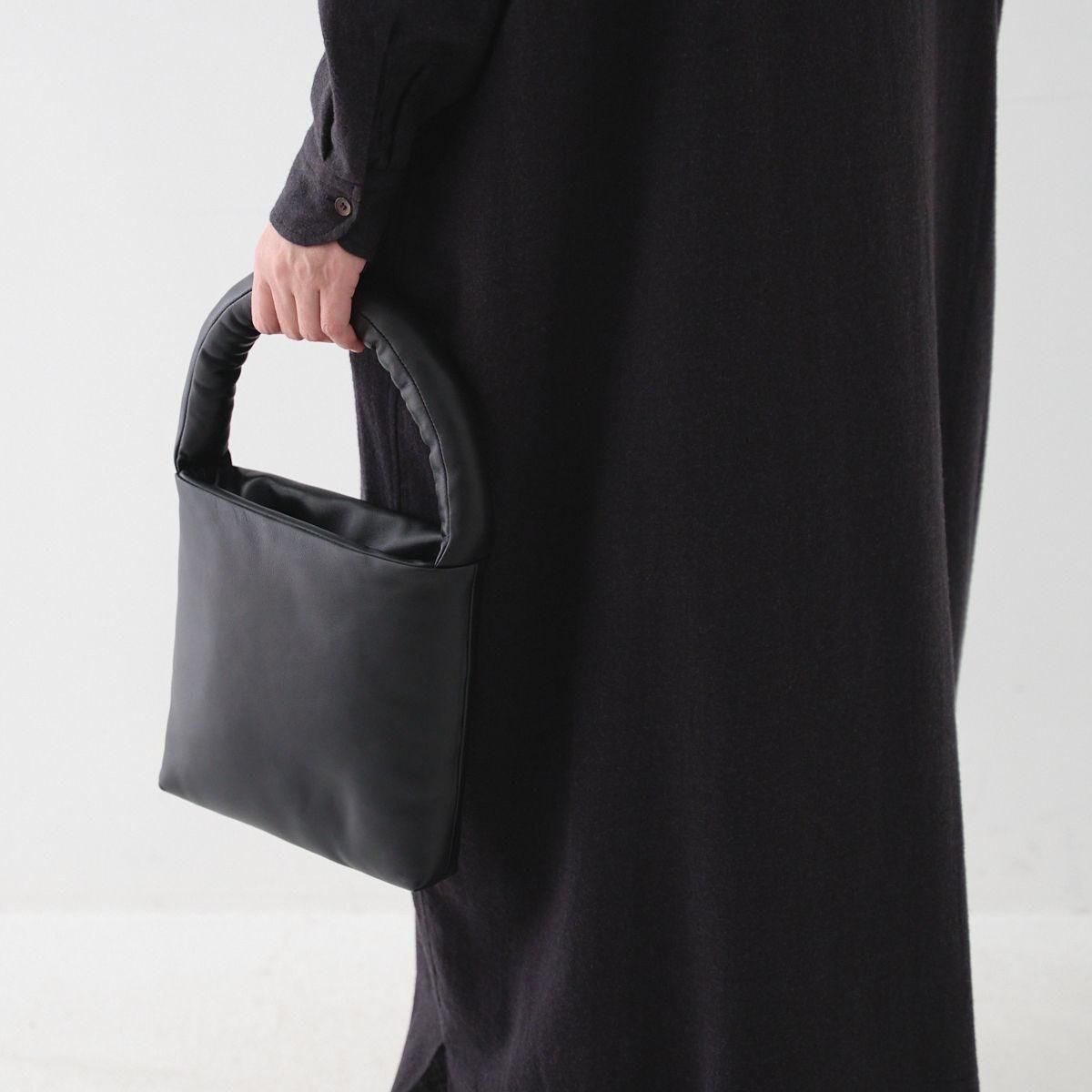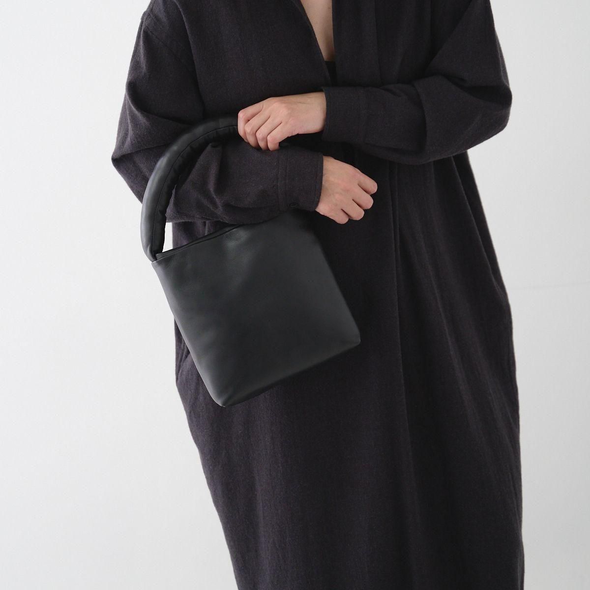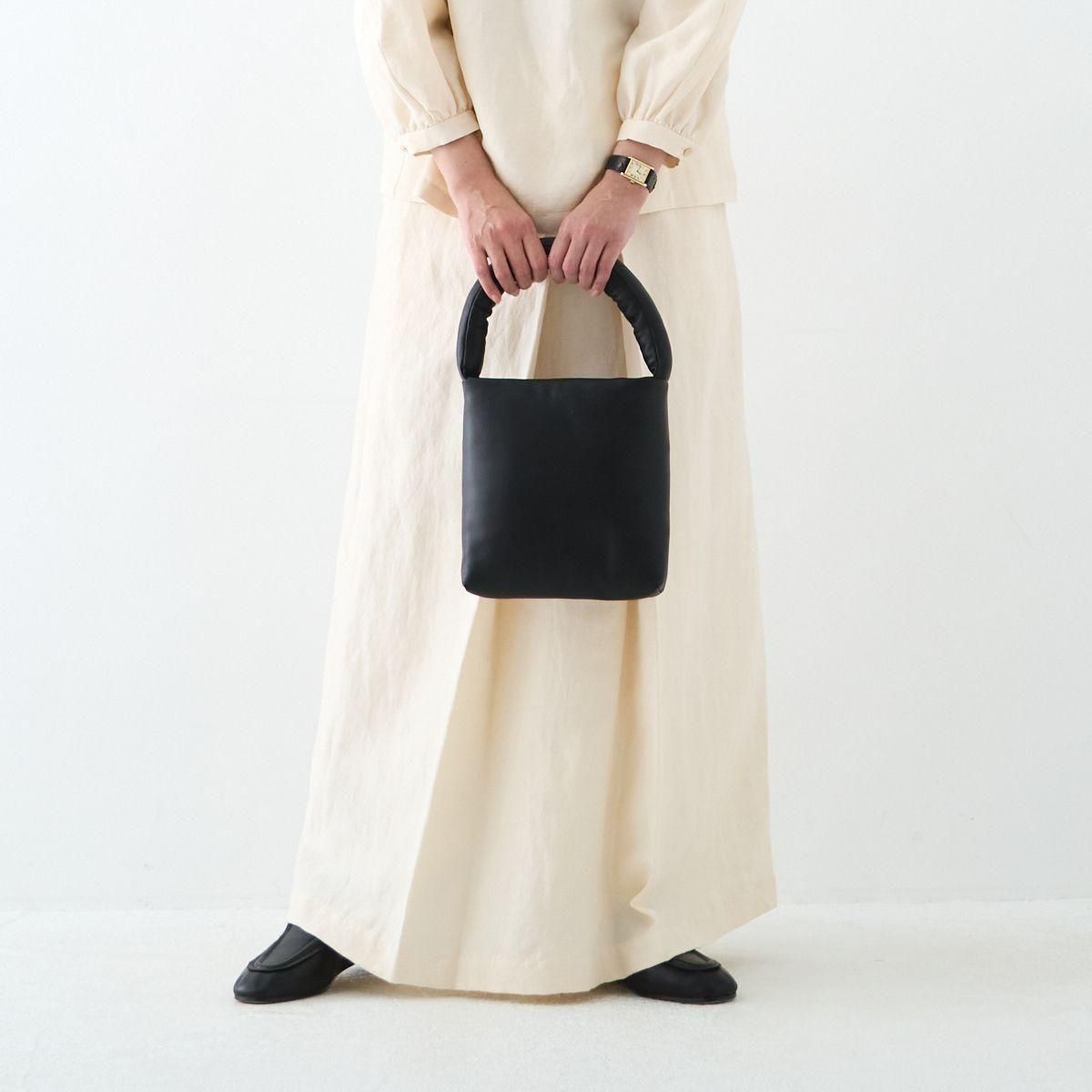 ドイツ発のレザーブランド"NOWHOW。 "NOW"=『今』、"HOW"=『どの様に』、革職人とオペラ振付師という異なる経歴をもつ2人の日本人によってベルリンにてデザインから製作まで全ての工程を行う。ヨーロッパの上質なレザーを使用しベーシックでありながらコンテンポラリーなプロダクトを提案されています。 熟練した革職人がひとつひとつハンドメイドで丁寧に仕立てており、軽量かつ柔らかな革は使い込むほどに味わいの出る経年変化を楽しめます。 こちらはラムレザーに中綿入りのスクエア型バッグ。 使用されているレザーは南フランスで約150年ラムのみをなめしてきた老舗のタンナーによるもの。名だたるメゾンブランドも同じ皮を使用するなど上質なレザーを使用。 ラムレザーの程よいハリと、ボディ、持ち手にも入った中綿のふわふわした感触が特徴でとても軽量な仕上がりに。美しいフォルムと小ぶりなサイズ感はコーディネートのアクセントになります。 ※この製品は天然の皮革を使用しております。皮革の表面は傷がつきやすいので丁寧にお取り扱いください。 ※職人による手作業の為、小ジワ、小キズ、多少の個体差などがございますが、味わいとしてご理解くださいませ。 また、ご使用中の摩擦や水濡れにより色落ちや色移りの可能性がございます。衣服との組み合わせの際は充分にご注意ください。 Composition: Lambskin, Polyester (Wadding) Size(mm): H210-360/W210 Handmade in Germany. color:Black お取り扱い店舗・・・dieci芝川ビル店