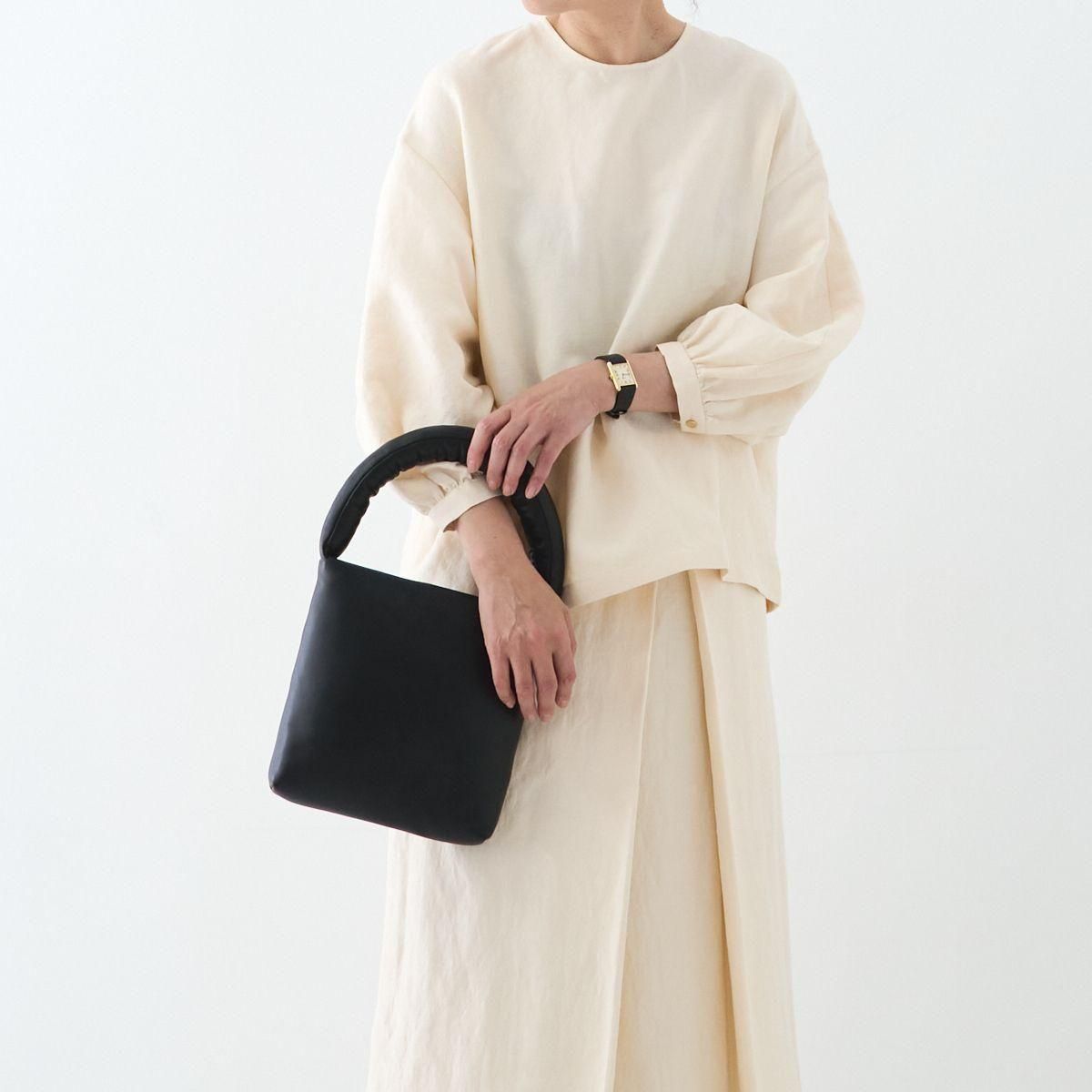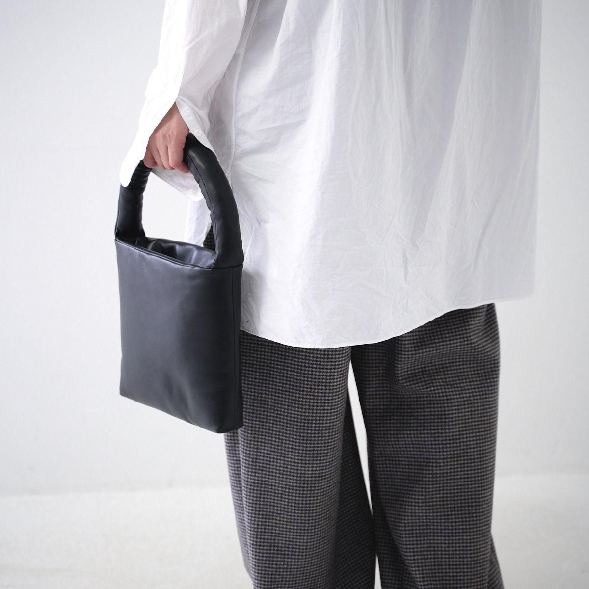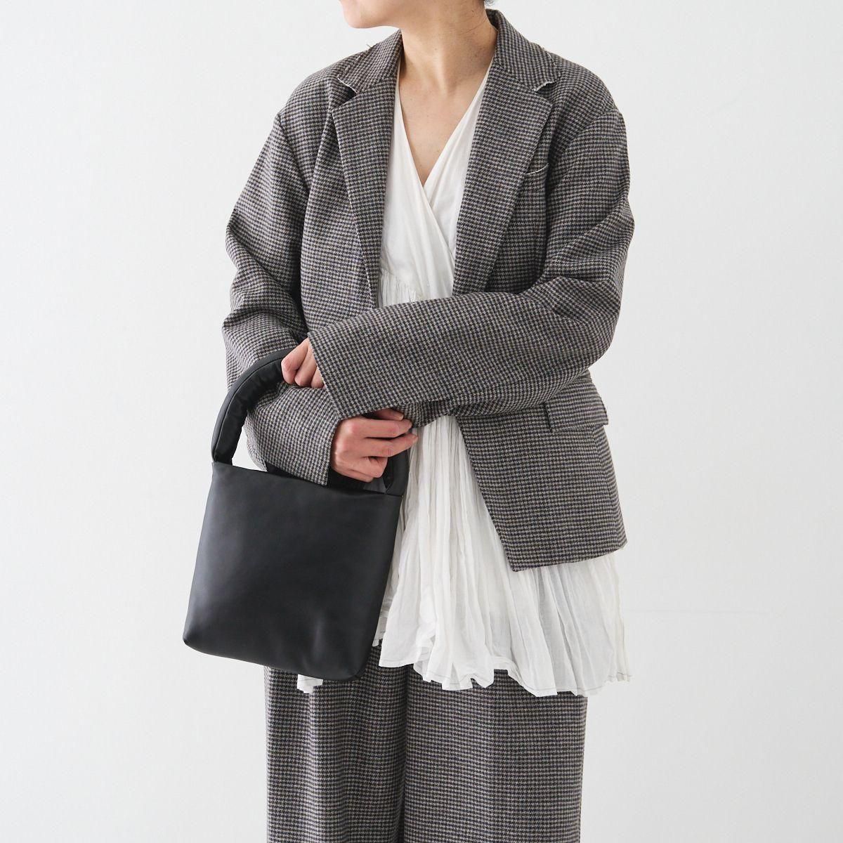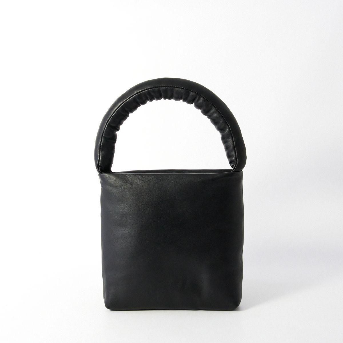 ドイツ発のレザーブランド"NOWHOW。 "NOW"=『今』、"HOW"=『どの様に』、革職人とオペラ振付師という異なる経歴をもつ2人の日本人によってベルリンにてデザインから製作まで全ての工程を行う。ヨーロッパの上質なレザーを使用しベーシックでありながらコンテンポラリーなプロダクトを提案されています。 熟練した革職人がひとつひとつハンドメイドで丁寧に仕立てており、軽量かつ柔らかな革は使い込むほどに味わいの出る経年変化を楽しめます。 こちらはラムレザーに中綿入りのスクエア型バッグ。 使用されているレザーは南フランスで約150年ラムのみをなめしてきた老舗のタンナーによるもの。名だたるメゾンブランドも同じ皮を使用するなど上質なレザーを使用。 ラムレザーの程よいハリと、ボディ、持ち手にも入った中綿のふわふわした感触が特徴でとても軽量な仕上がりに。美しいフォルムと小ぶりなサイズ感はコーディネートのアクセントになります。 ※この製品は天然の皮革を使用しております。皮革の表面は傷がつきやすいので丁寧にお取り扱いください。 ※職人による手作業の為、小ジワ、小キズ、多少の個体差などがございますが、味わいとしてご理解くださいませ。 また、ご使用中の摩擦や水濡れにより色落ちや色移りの可能性がございます。衣服との組み合わせの際は充分にご注意ください。 Composition: Lambskin, Polyester (Wadding) Size(mm): H210-360/W210 Handmade in Germany. color:Black お取り扱い店舗・・・dieci芝川ビル店