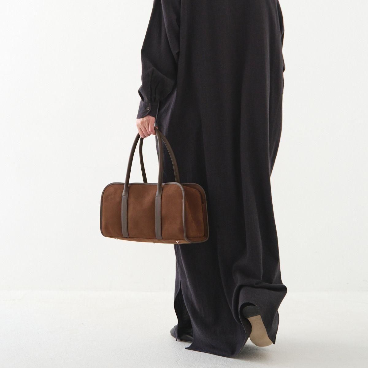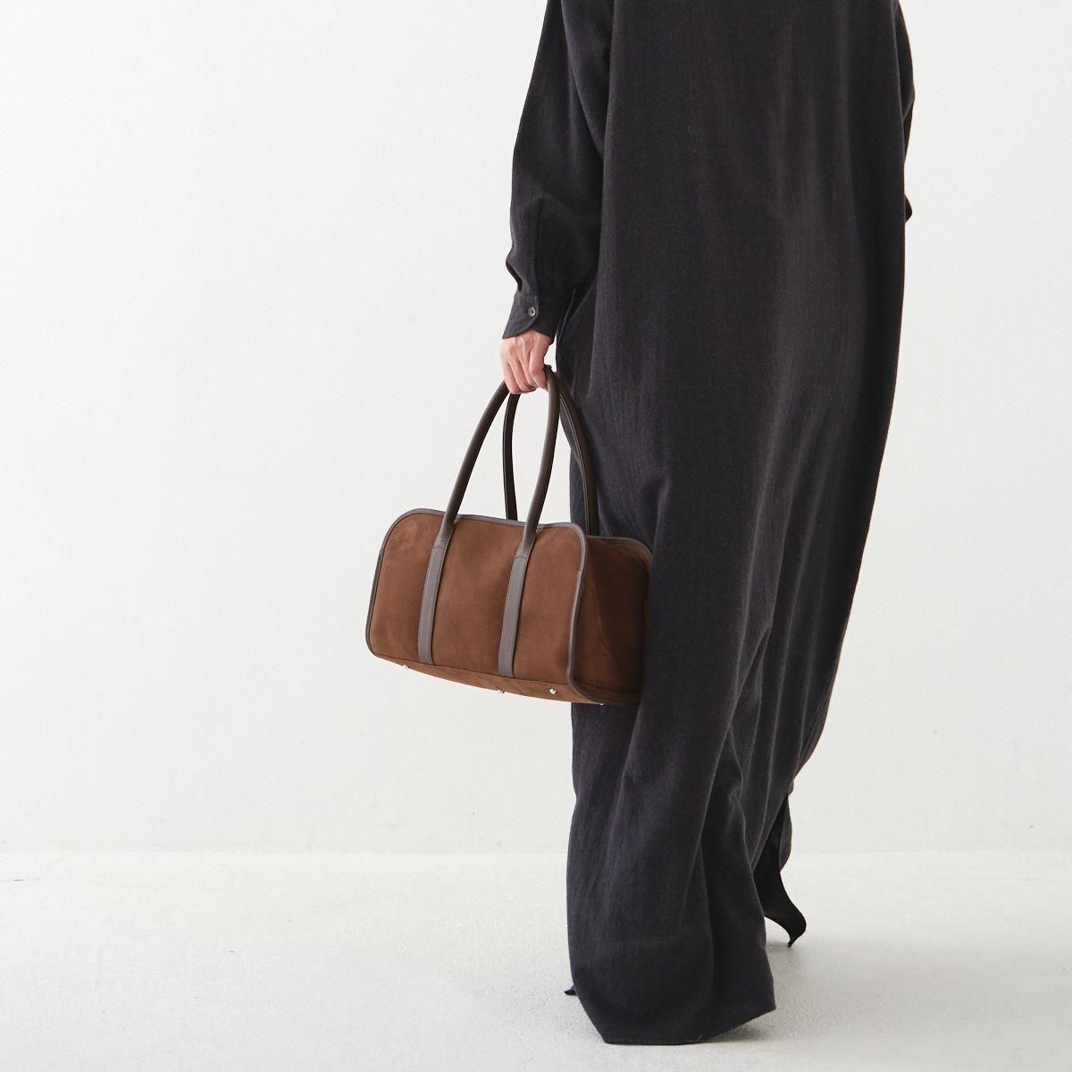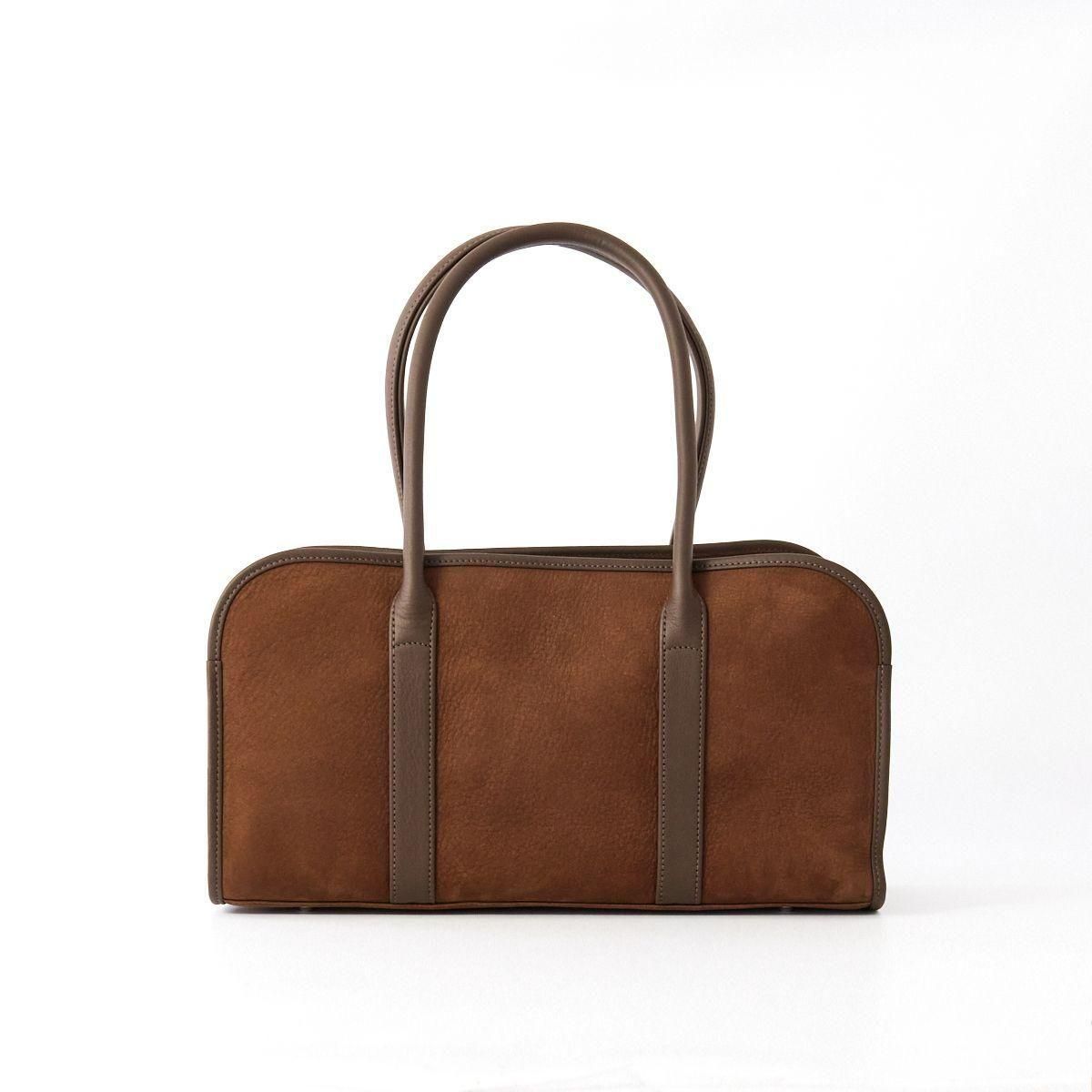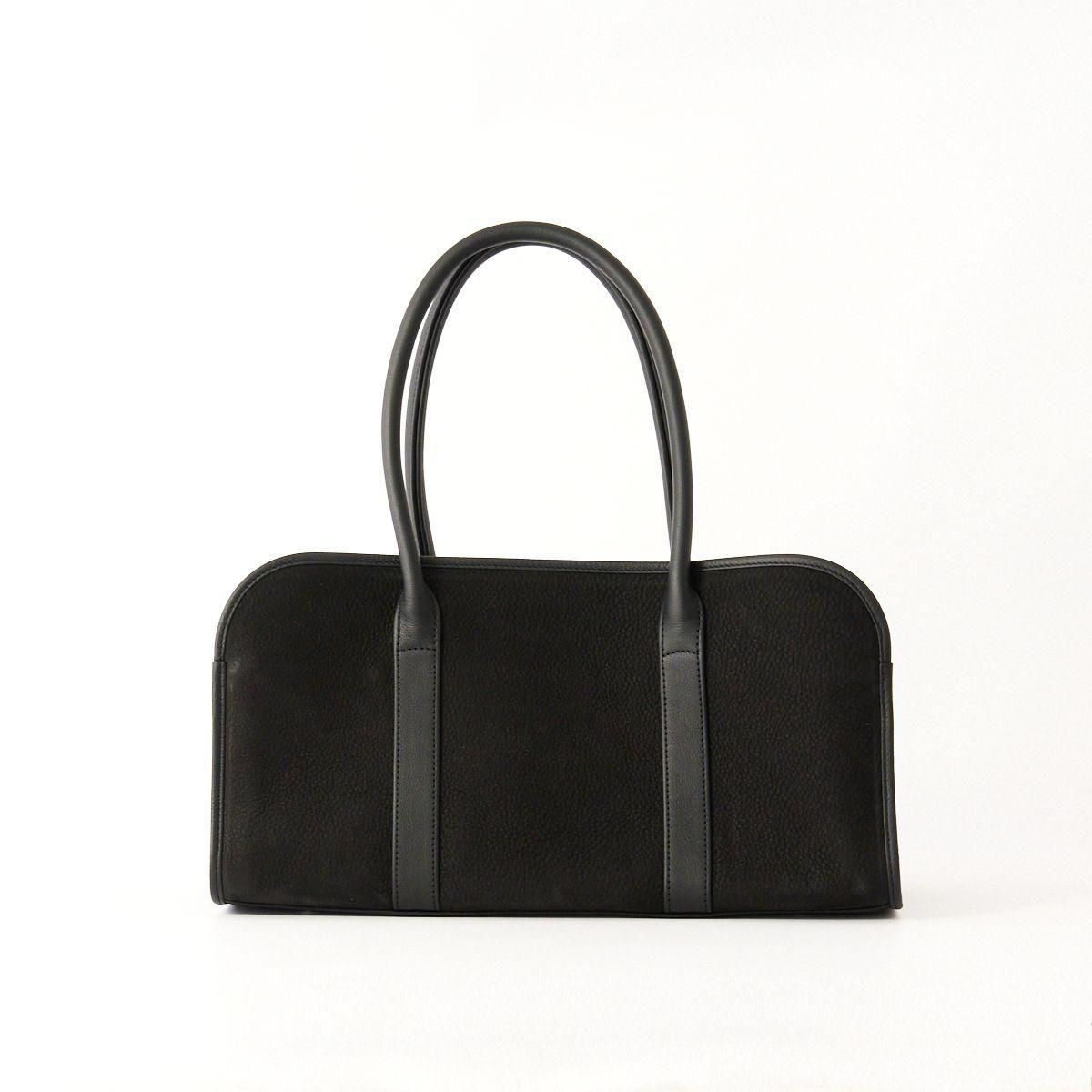 ドイツ発のレザーブランド"NOWHOW。 "NOW"=『今』、"HOW"=『どの様に』、革職人とオペラ振付師という異なる経歴をもつ2人の日本人によってベルリンにてデザインから製作まで全ての工程を行う。ヨーロッパの上質なレザーを使用しベーシックでありながらコンテンポラリーなプロダクトを提案されています。 熟練した革職人がひとつひとつハンドメイドで丁寧に仕立てており、軽量かつ柔らかな革は使い込むほどに味わいの出る経年変化を楽しめます。 こちらはヌバックを使用したRIDEG wide。 サイドのマチ部分を延長し帯状に渡された開閉口が特徴のデザインです。 外から中が見えにくくなっていて、その帯は少しカーブを施されているので、物の出し入れもしやすくなっています。パイピングやエッジなど細かい部分がハンドクラフトならではのハンドバッグです。内側に小さめのポケットが2つ付いています。底鋲付き。 ※この製品は天然の皮革を使用しております。皮革の表面は傷がつきやすいので丁寧にお取り扱いください。 ※職人による手作業の為、小ジワ、小キズ、多少の個体差などがございますが、味わいとしてご理解くださいませ。 また、ご使用中の摩擦や水濡れにより色落ちや色移りの可能性がございます。衣服との組み合わせの際は充分にご注意ください。 size:ONE SIZE W345mm D150mm H170mm(STRAP LENGTH 520mm) material: Cow leather(南フランス製牛革)/パイピング部分 Lambskin color:Black / Dark Brown お取り扱い店舗・・・dieci芝川ビル店