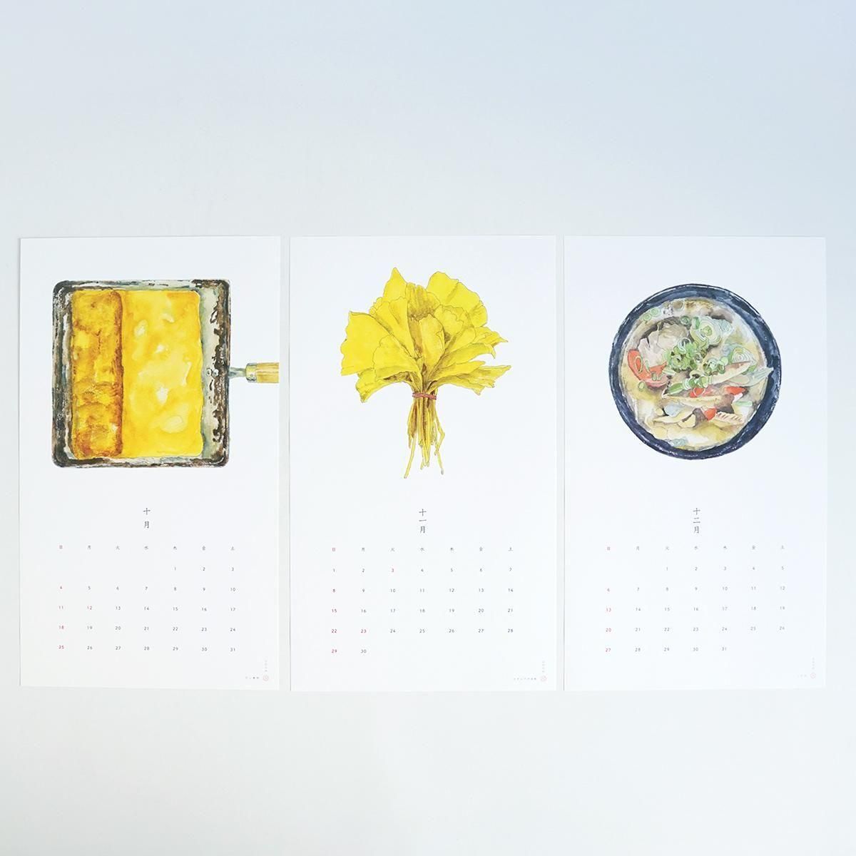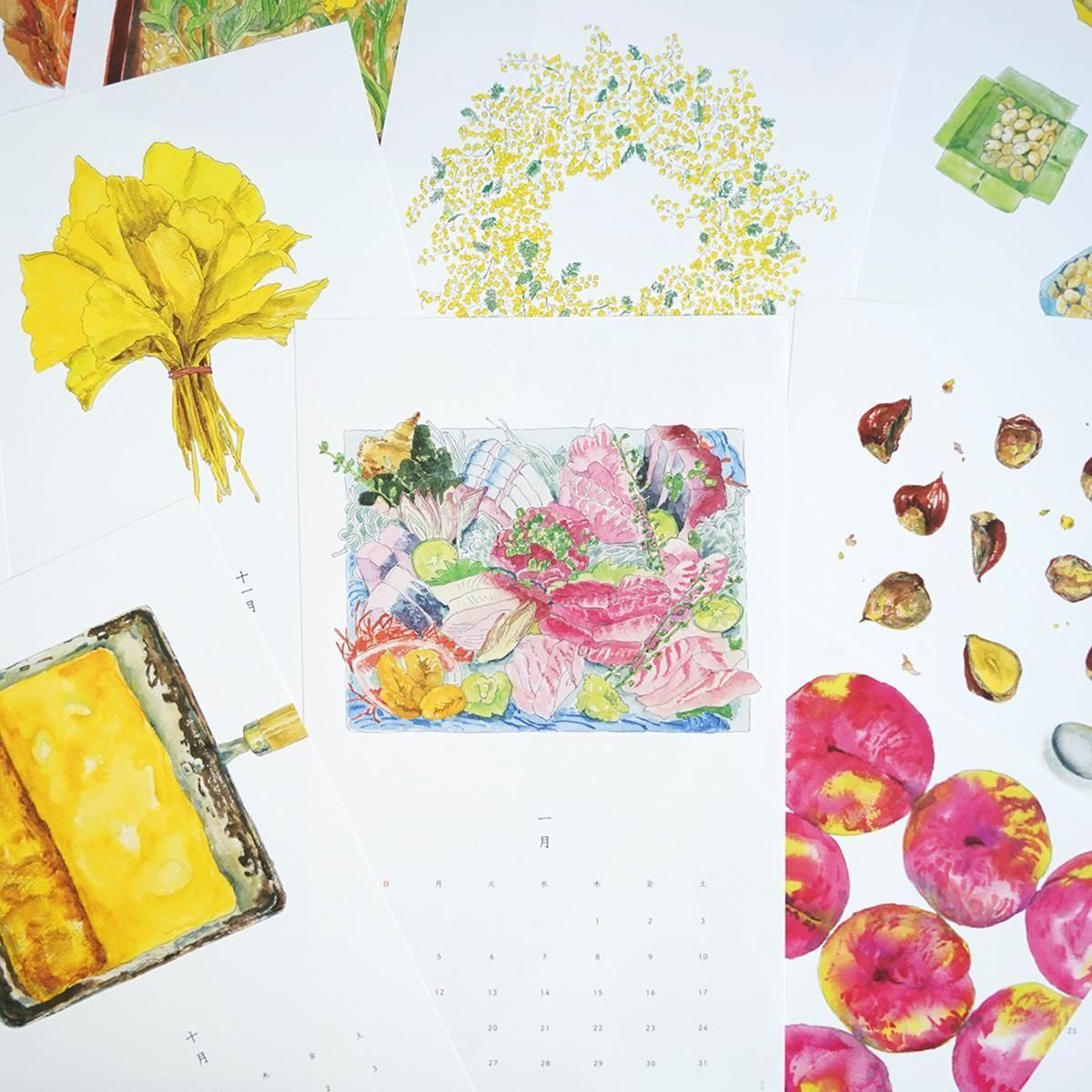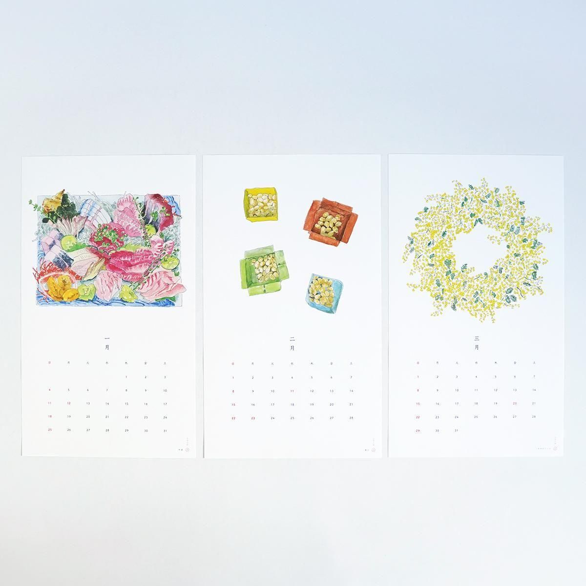 日傘・雨傘を生地から制作し、一本ずつ手仕事で仕上げるイイダ傘店。 飯田純久さん描き下ろしの日常のスケッチが、12枚のカレンダーになって届きました。 旬の植物や食べもの、季節の行事が田さんらしいタッチで描かれています。 日々の暮らしにささやかな彩りを与えてくれる、丁寧な暮らしを教えてくれるようなやさしい佇まいのカレンダー。 すっきりと飾りやすいサイズです。 一月 刺盛 二月 節分 三月 ミモザのリース 四月 タケノコごはん 五月 矢車草と夕化粧 六月 やきそばパンとナポリタン 七月 桃 八月 すいか割り 九月 くり 十月 だし巻卵 十一月 イチョウの花束 十二月 ぶた汁 size :185mm × 315mm お取り扱い店舗・・・dieci天神橋店