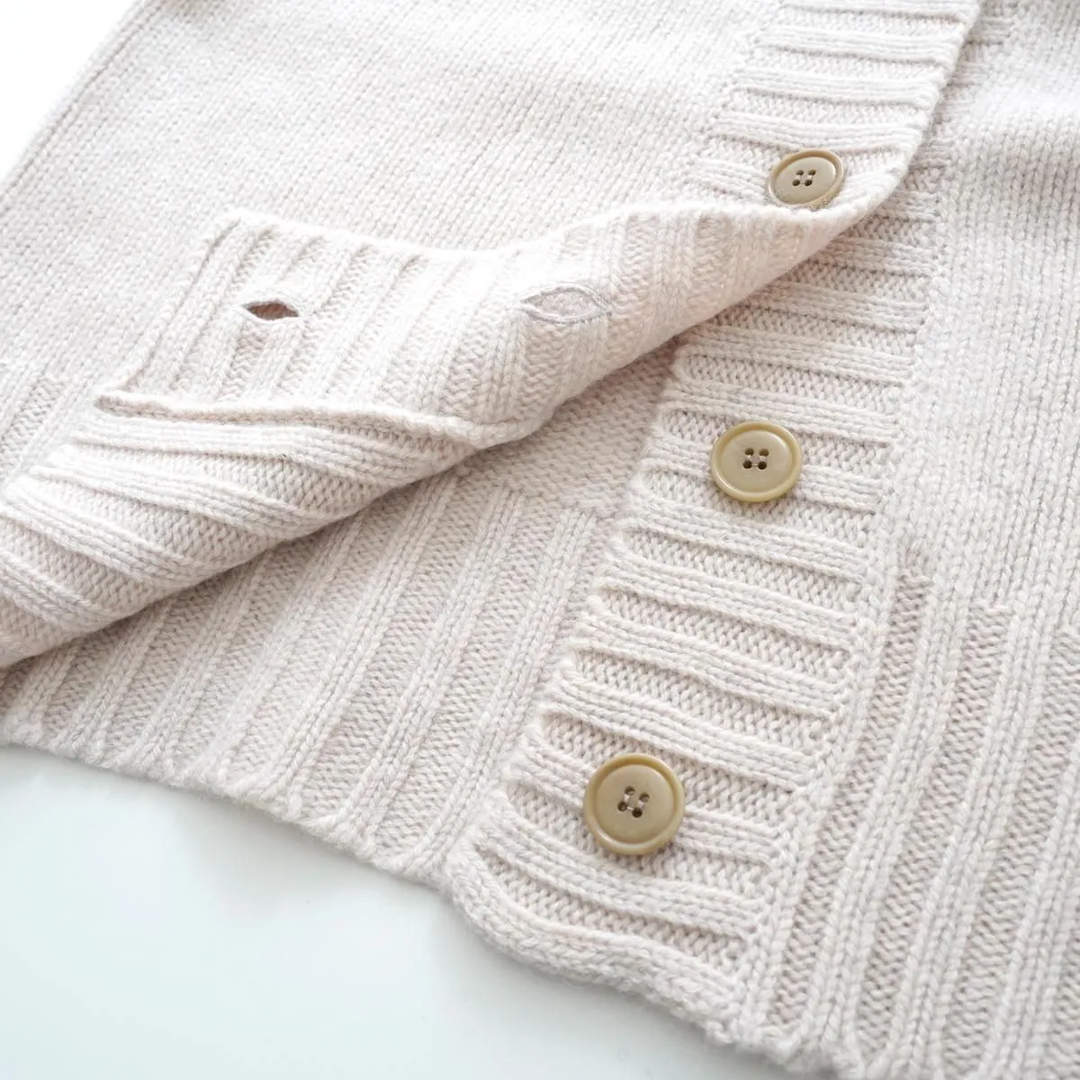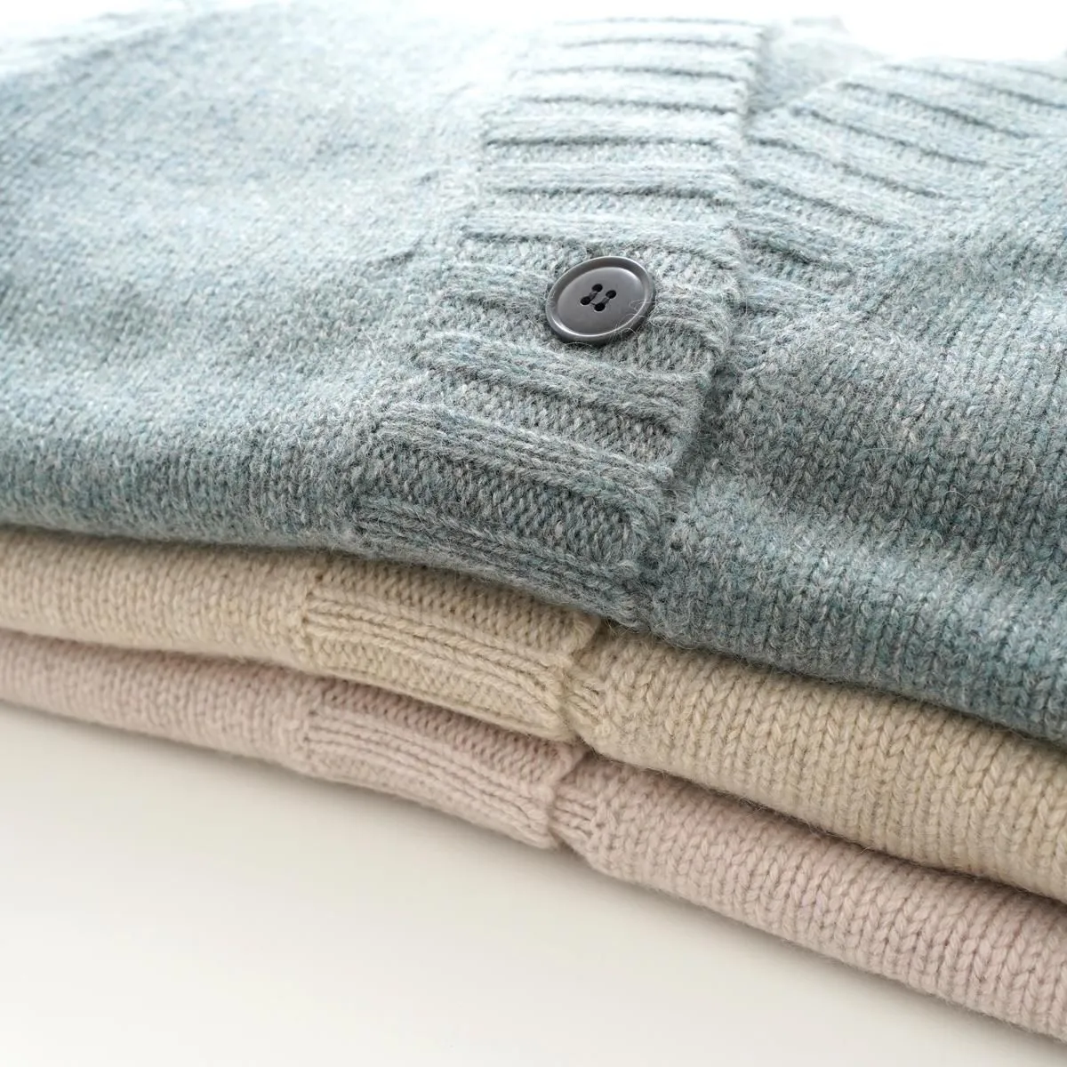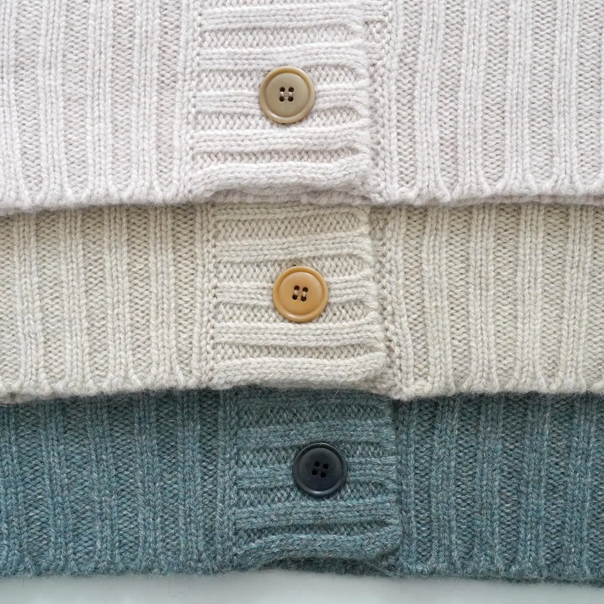 eleven 2ndは橋本靖代さんによる暮らしを意識したニットプロダクトです。20AWより上質なニットウエアやストールを展開しています。 ヤクは保温性に優れ、カシミヤにも匹敵する滑らかな素材です。そこにふんわり繊細で弾力のあるラムウールを組み合わせた、とっても贅沢なカーディガン。複数色をミックスした糸で編まれていることでより素朴で温かみのある表情が感じられます。大きく取られたリブのデザインとボタンがアクセントに。ソフトな肌触りと軽い着心地で、寒い冬に手放せなくなるアイテムです。 25AW size:M(one size) 着丈64cm/身幅50cm/裄丈77cm 参考寸法(平置き) ニットの為多少の差異がございます。 color:Pale pink・Mink・Moss Grey material: ラムウール53% ヤク47% model:163cm(Mink・Moss Grey着用) 取扱い店舗…dieci芝川ビル店 size_chart