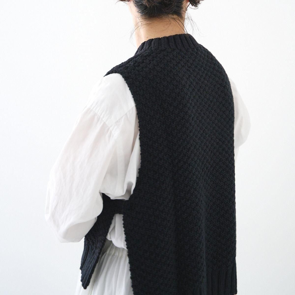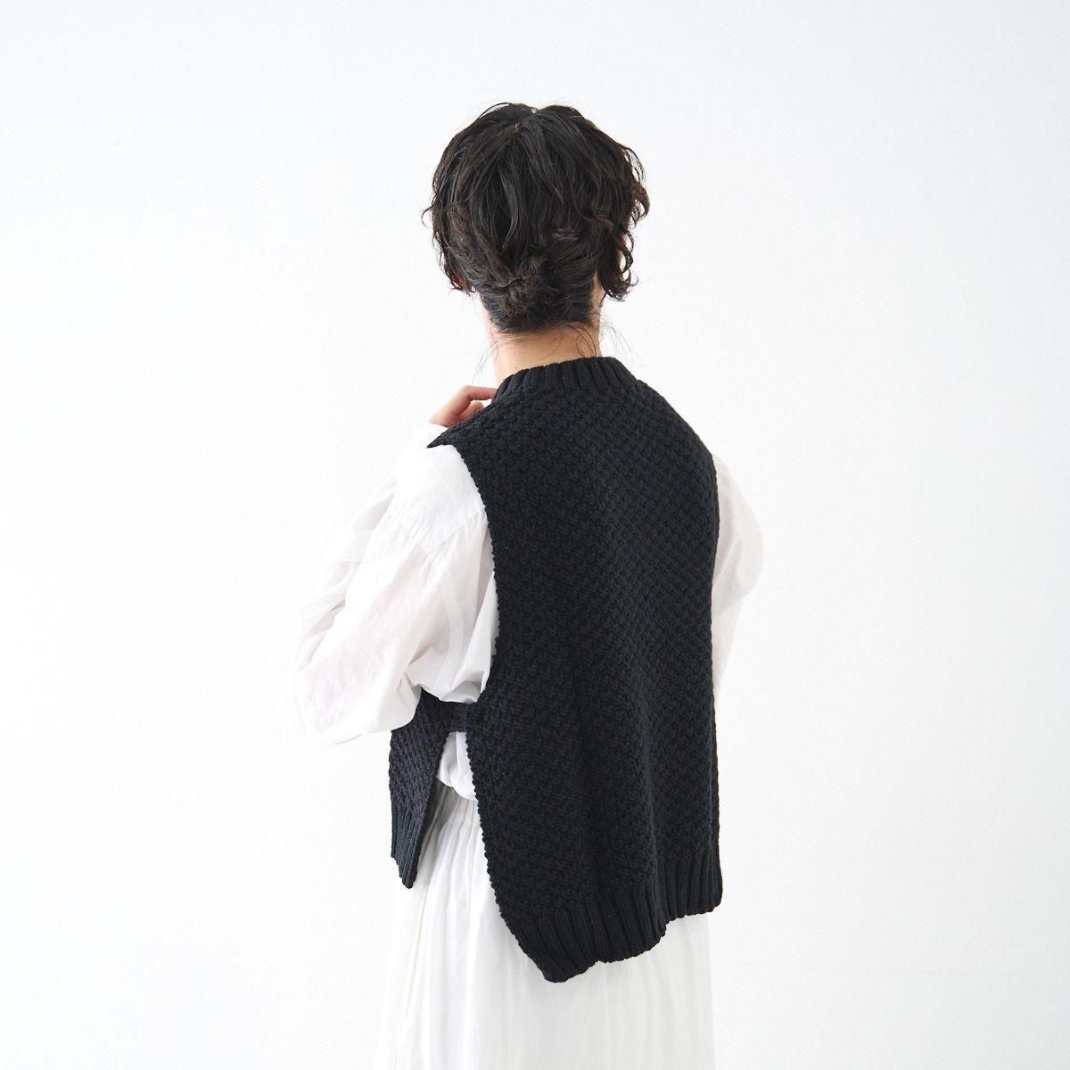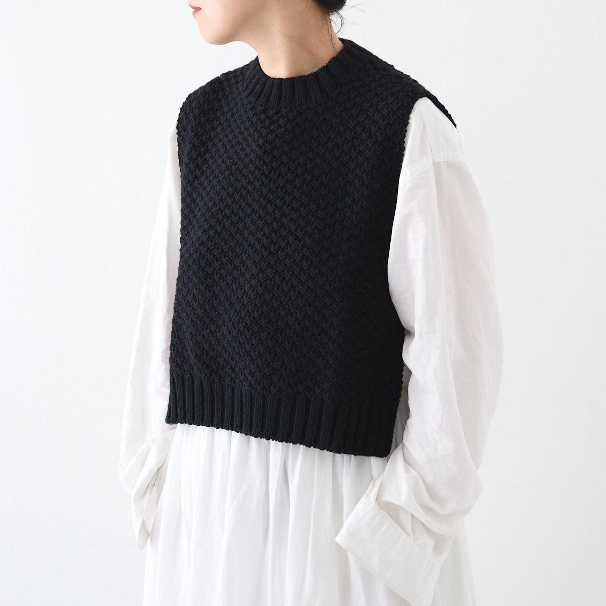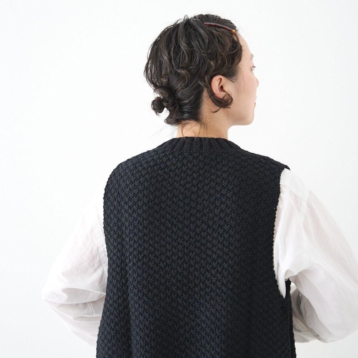 イタリアの上質な毛糸を使用した、鹿子編みが美しく目を惹くベスト。 前後の長さの差を少し和らげ、襟の長さも少し短めに調節していただきました。 ブラウス、ワンピースに合わせていただくととても素敵です。 着るほどに愛着も増していくTORICIオールハンドニットです。 イタリア糸使用 日本製 手編み size: F 参考寸法(平置き) 1点1点個体差がございます。 着丈 約前43cm 後49~50cm 身幅 約45~46cm 肩幅 約37cm 襟 約4cm color: ブラック,グレージュ model:163cm 取扱い店舗…dieci芝川ビル店 ------------------------------------------------------------------------------- TORICI(トリチ)はデザイナー鳥飼さんによる、手触りの良さ、軽さ、強さ、そして色彩の美しさ全てを満たす高品質な糸を世界中から厳選し日本の職人の手仕事で一着一着丁寧に編み上げる高いクオリティとシンプルなデザインで長く使える時代に左右されない「定番」としてのニットウェアブランドです。