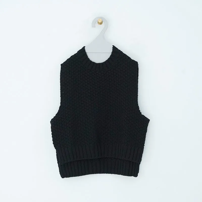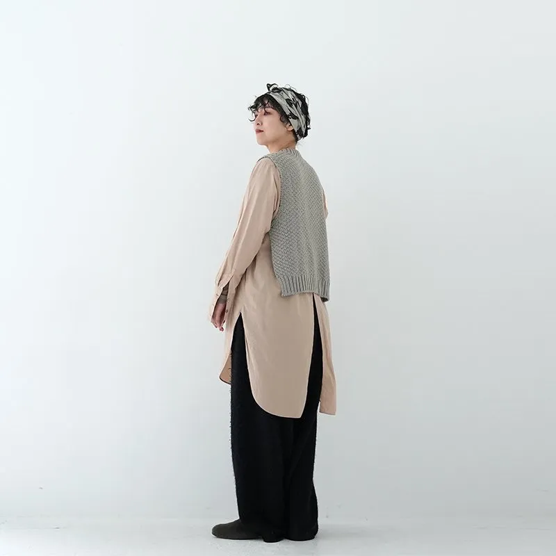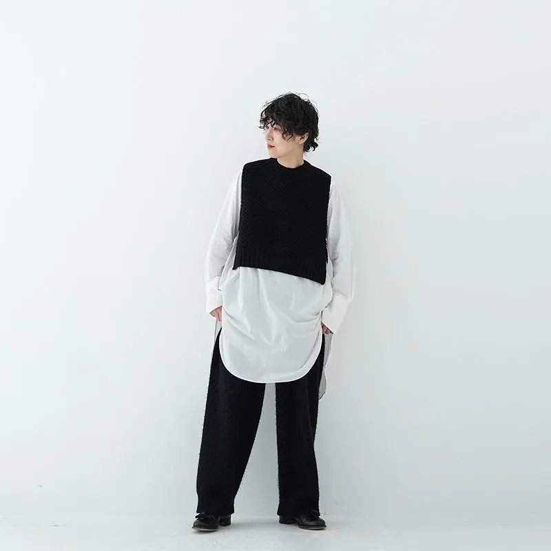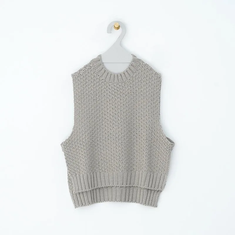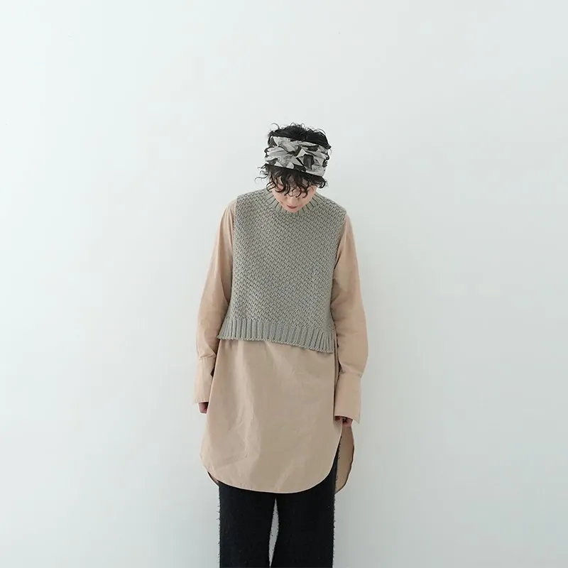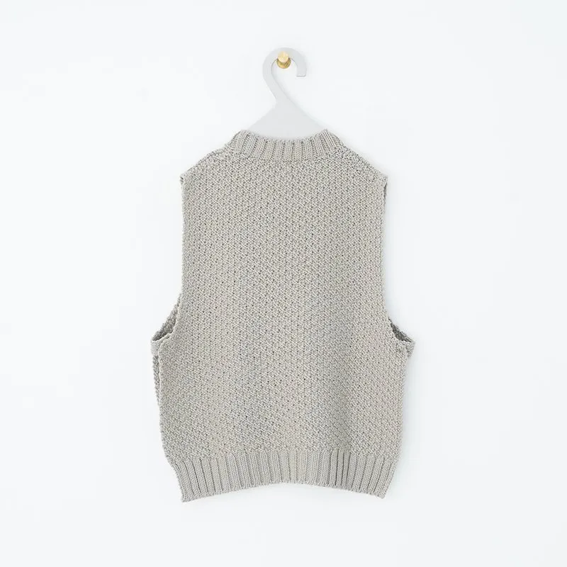 イタリアの上質な毛糸を使用した、鹿子編みが美しく目を惹くベスト。 前後の長さの差を少し和らげ、襟の長さも少し短めに調節していただきました。 ブラウス、ワンピースに合わせていただくととても素敵です。 着るほどに愛着も増していくTORICIオールハンドニットです。 イタリア糸使用 日本製 手編み size: F 参考寸法(平置き) 1点1点個体差がございます。 着丈 約前43cm 後49~50cm 身幅 約45~46cm 肩幅 約37cm 襟 約4cm color: ブラック,グレージュ model:163cm 取扱い店舗…dieci芝川ビル店 ------------------------------------------------------------------------------- TORICI(トリチ)はデザイナー鳥飼さんによる、手触りの良さ、軽さ、強さ、そして色彩の美しさ全てを満たす高品質な糸を世界中から厳選し日本の職人の手仕事で一着一着丁寧に編み上げる高いクオリティとシンプルなデザインで長く使える時代に左右されない「定番」としてのニットウェアブランドです。
