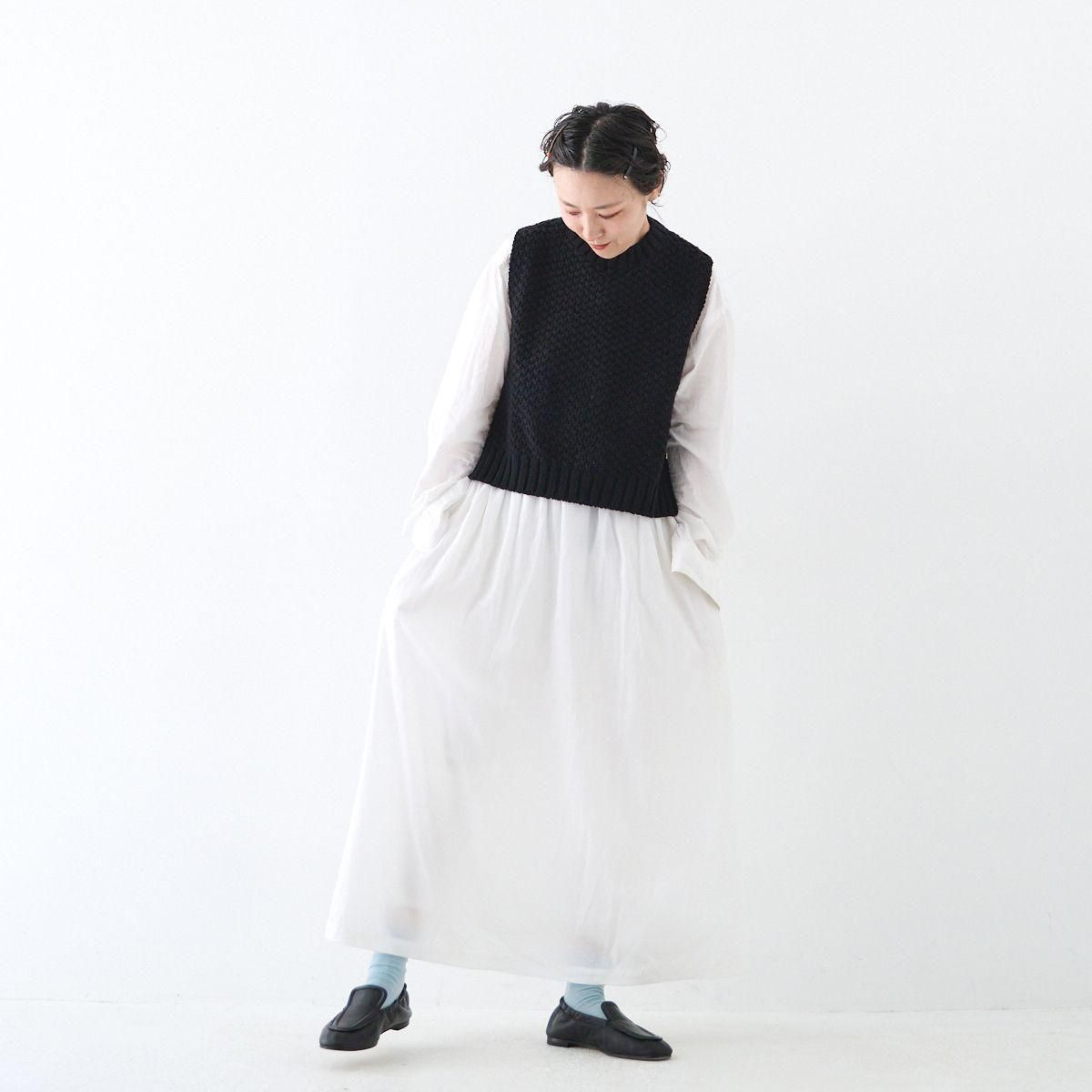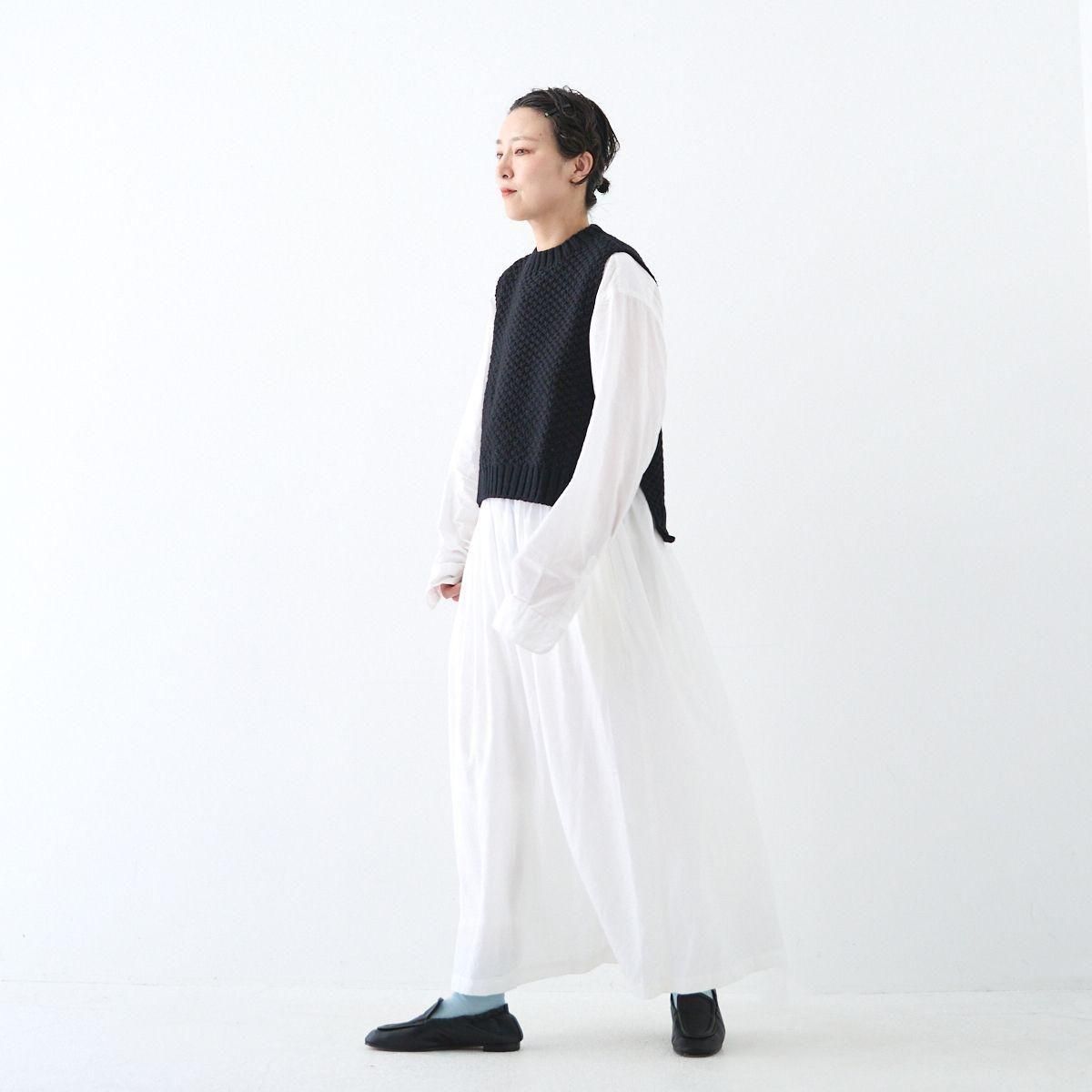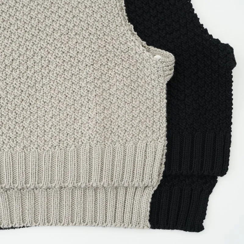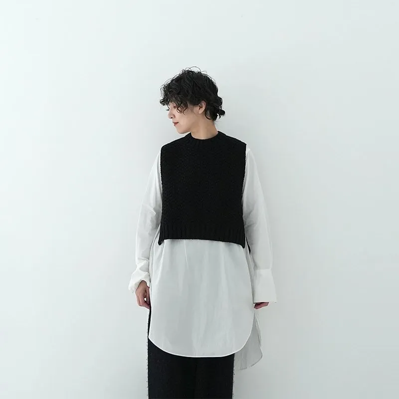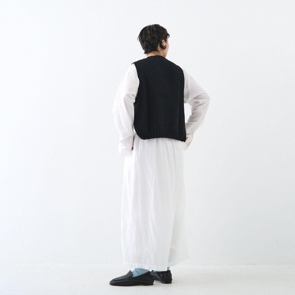 イタリアの上質な毛糸を使用した、鹿子編みが美しく目を惹くベスト。 前後の長さの差を少し和らげ、襟の長さも少し短めに調節していただきました。 ブラウス、ワンピースに合わせていただくととても素敵です。 着るほどに愛着も増していくTORICIオールハンドニットです。 イタリア糸使用 日本製 手編み size: F 参考寸法(平置き) 1点1点個体差がございます。 着丈 約前43cm 後49~50cm 身幅 約45~46cm 肩幅 約37cm 襟 約4cm color: ブラック,グレージュ model:163cm 取扱い店舗…dieci芝川ビル店 ------------------------------------------------------------------------------- TORICI(トリチ)はデザイナー鳥飼さんによる、手触りの良さ、軽さ、強さ、そして色彩の美しさ全てを満たす高品質な糸を世界中から厳選し日本の職人の手仕事で一着一着丁寧に編み上げる高いクオリティとシンプルなデザインで長く使える時代に左右されない「定番」としてのニットウェアブランドです。