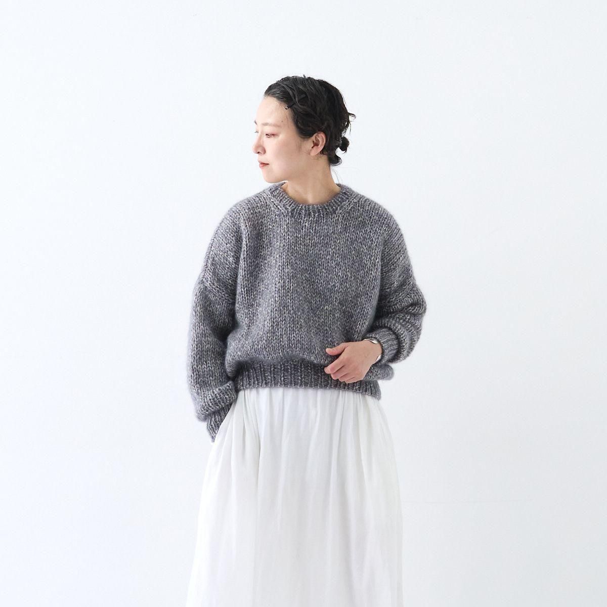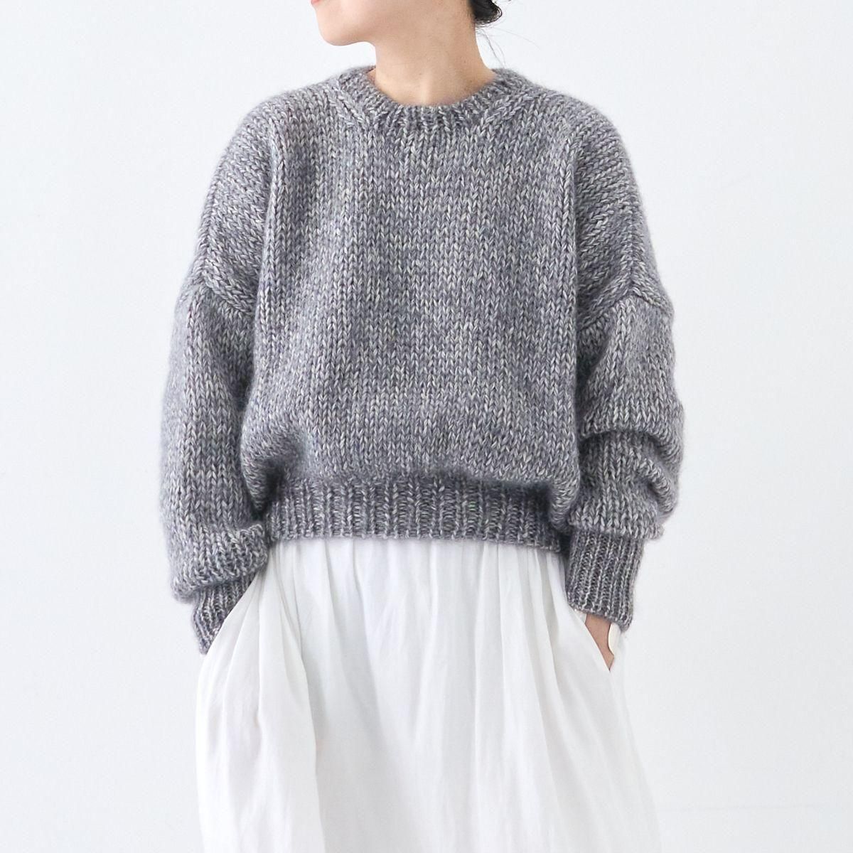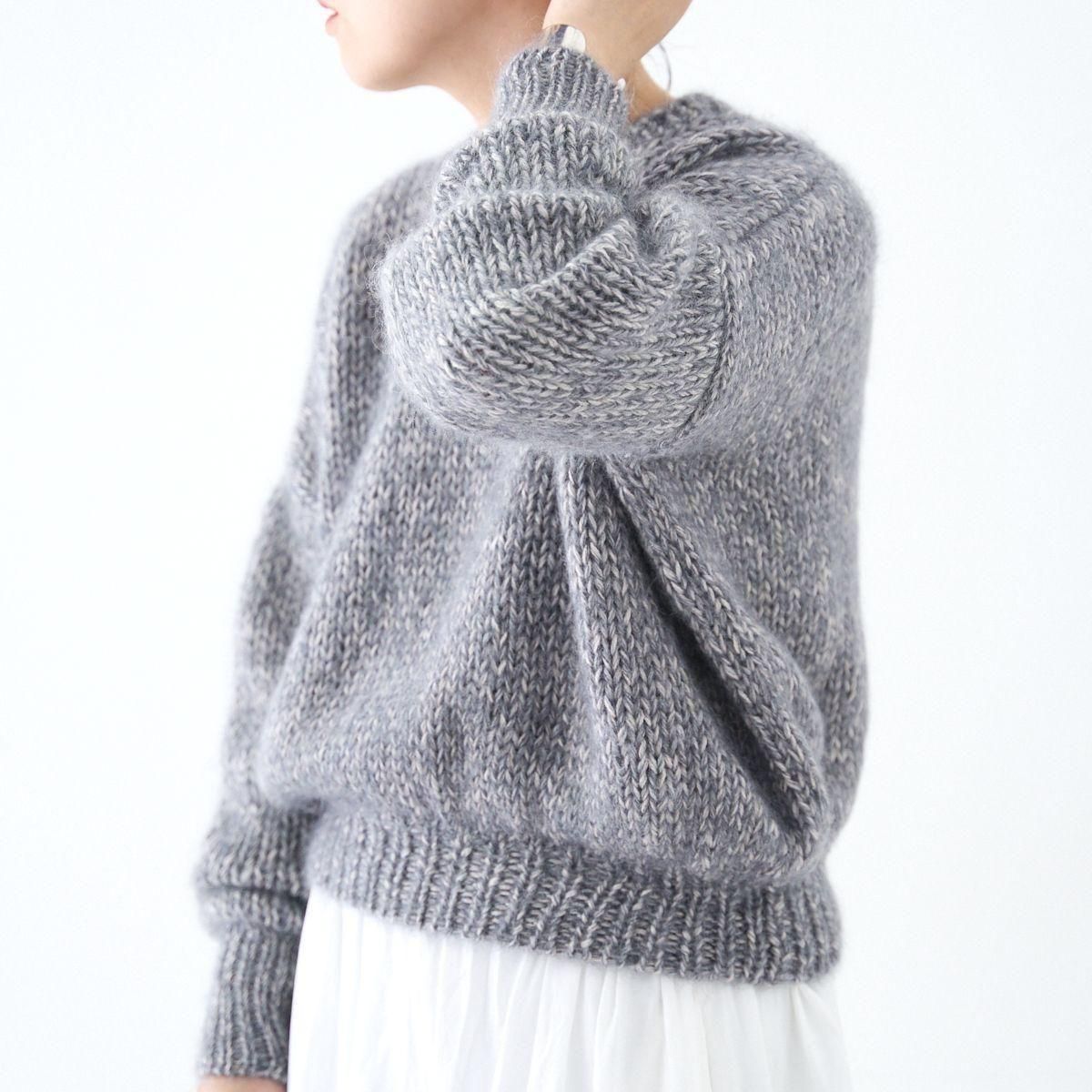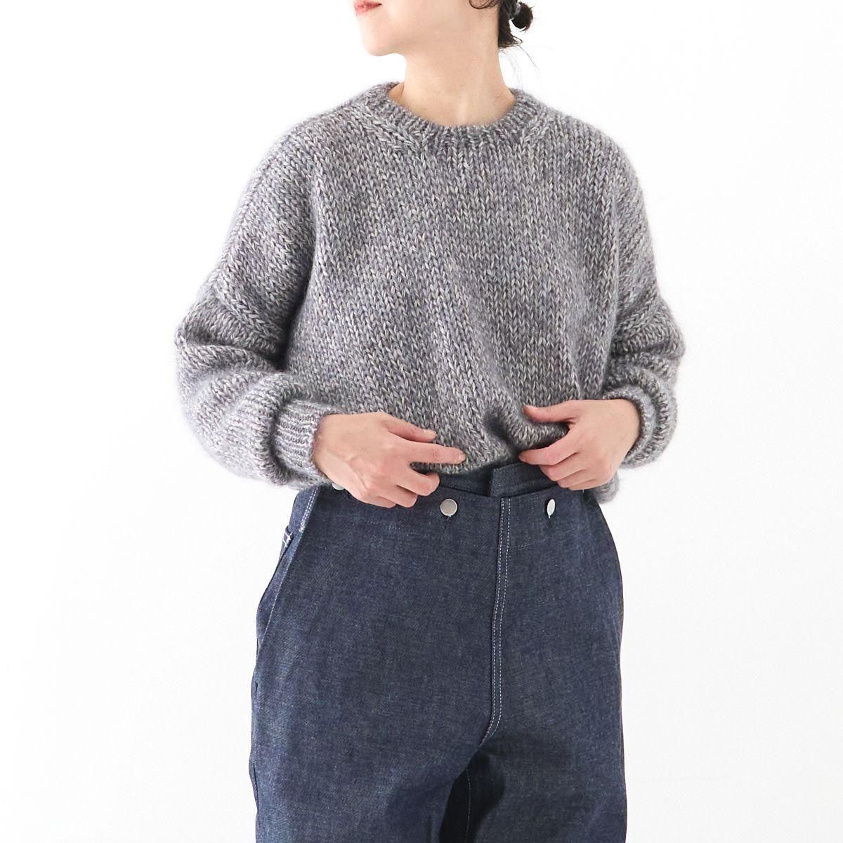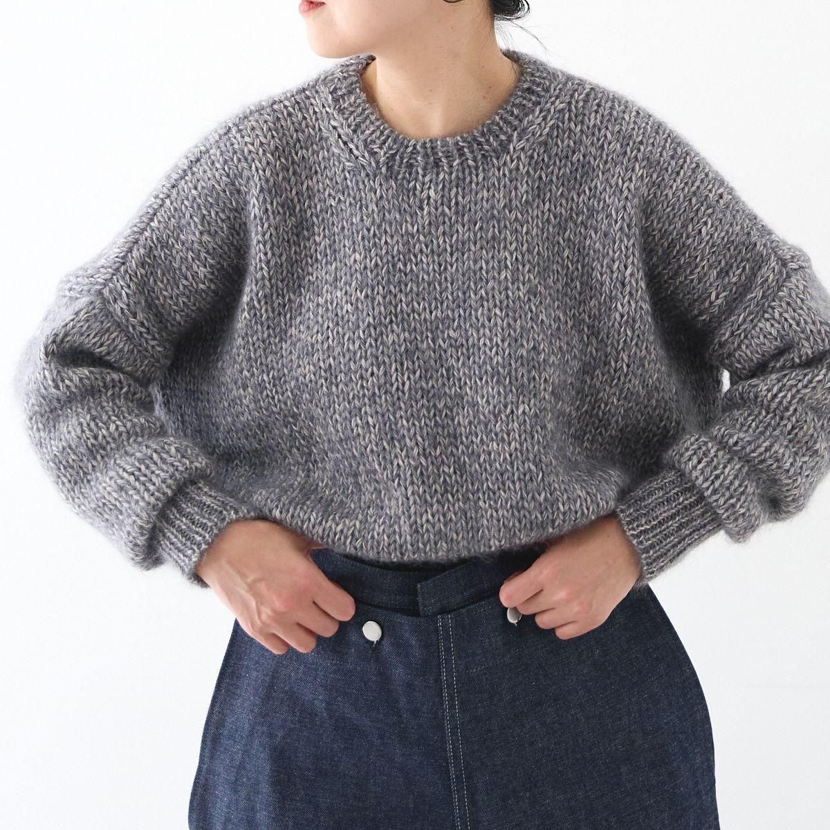 TORICI レベルセーター イタリア糸使用 日本製 手編み スーパーキッドモヘヤとファインメリノウールにシルクをミックスした発色の良い糸を使用し、手編みでふっくら編み上げられた"レベルセーター"。 90年代をイメージし作られていて、どこかレトロな雰囲気が漂う仕上がりに。ウエストが絞られていてパンツ、スカート問わず相性の良いセーターです。 手編み商品の為、風合いやサイズ感などに個体差がございます。ご理解の上でご購入くださいませ。 size: F 参考寸法(平置き) 1点1点個体差がございます。 着丈 約51cm 身幅 約65cm 裄丈 約85cm color: グレー material: ウール55%/モヘア32%/シルク13% 取扱い店舗…dieci芝川ビル店 ------------------------------------------------------------------------------- TORICI(トリチ)は手触りの良さ、軽さ、強さ、そして色彩の美しさ 全てを満たす高品質な糸を世界中から厳選し日本の職人の手仕事で一着一着丁寧に編み上げる高いクオリティとシンプルなデザインで長く使える時代に左右されない「定番」としてのニットウェアブランドです。