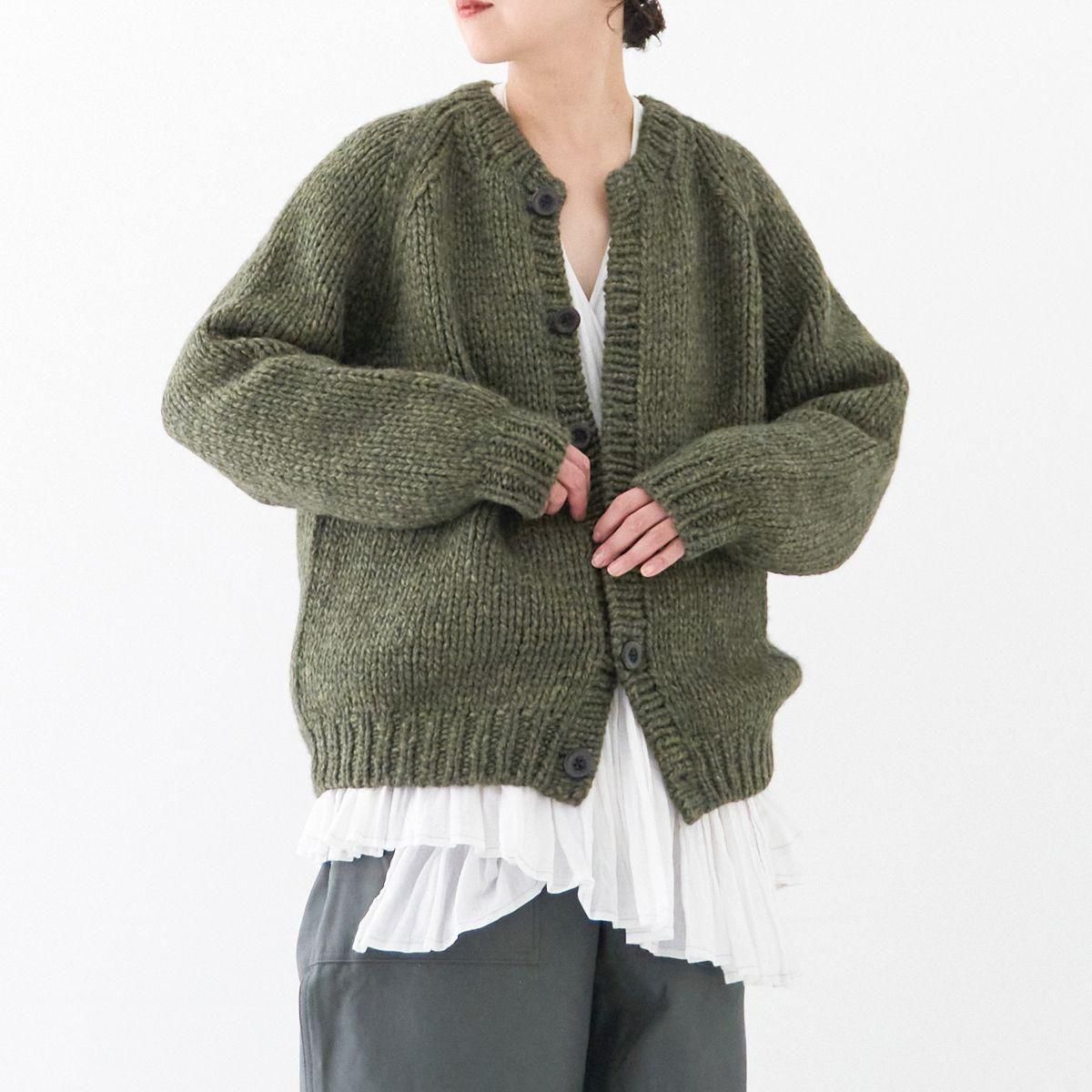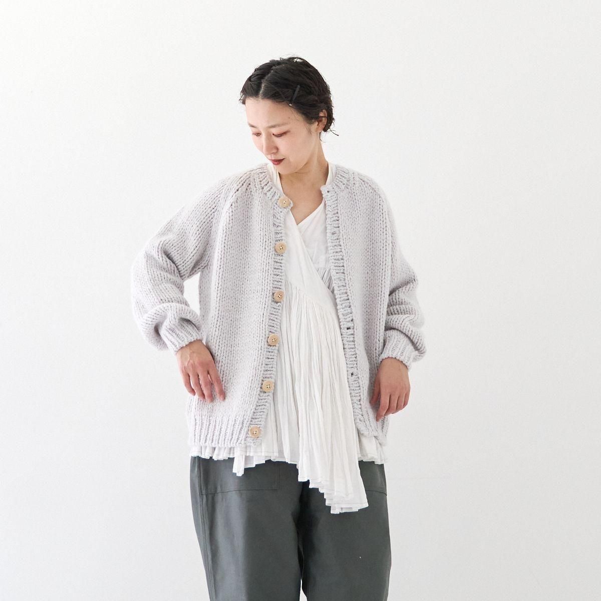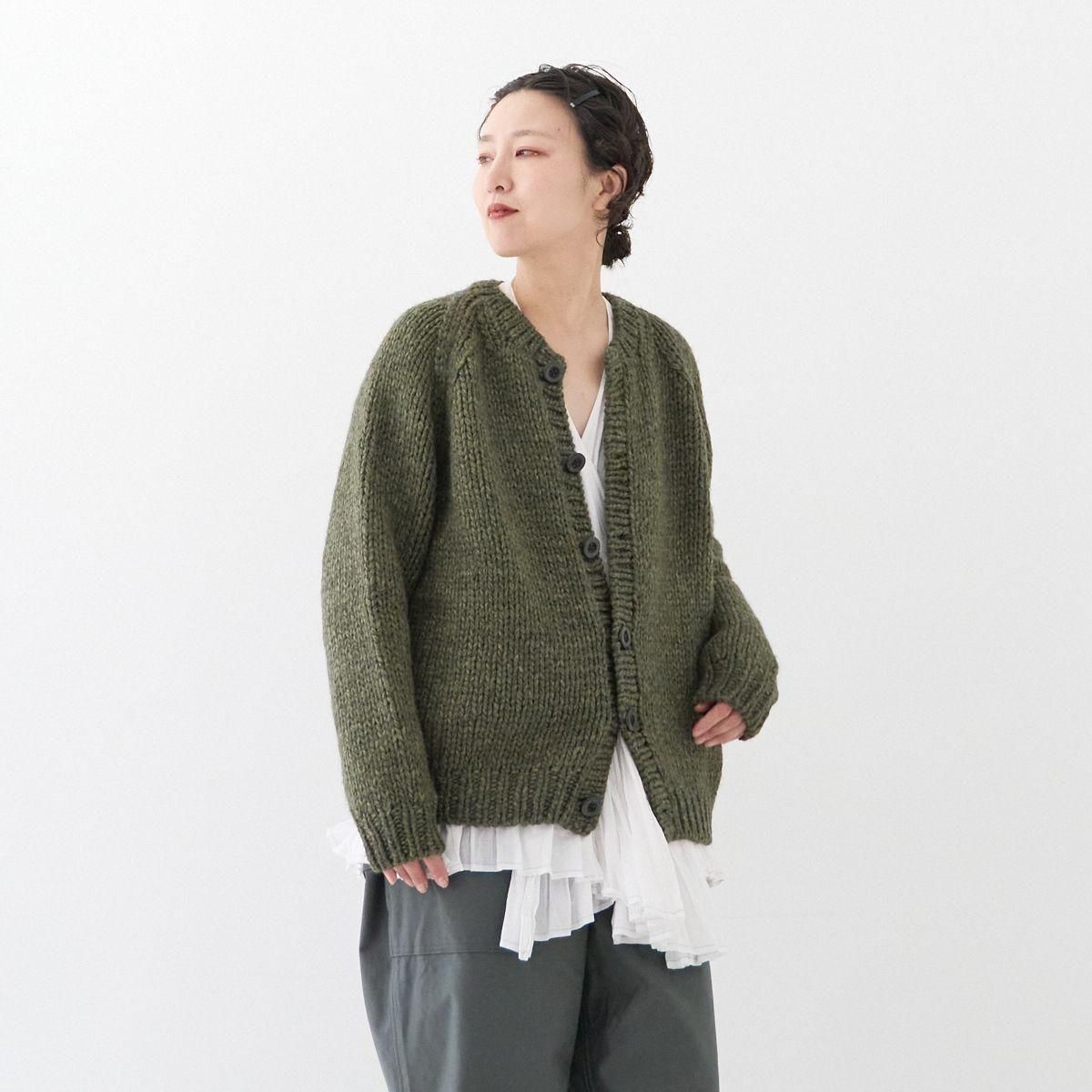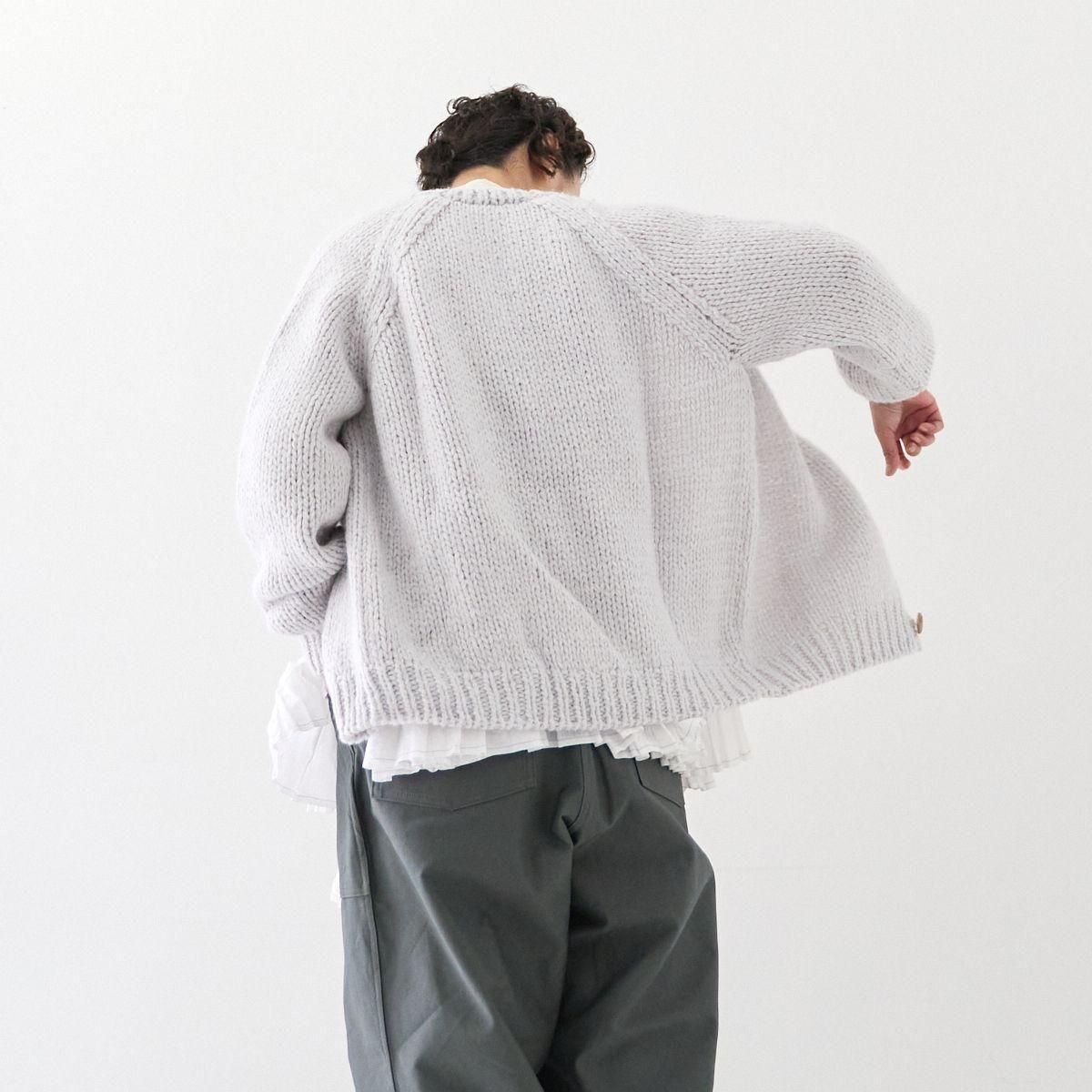 TORICI AIRカーディガン イタリア糸使用 日本製 手編み 軽さと発色の良さそして柔らかい肌触りが特徴のニットです。イタリアの撚糸の得意な紡績会社の糸を使用し、綺麗な発色と光沢、糸の膨らみがあります。カジュアルなシルエットですが、糸のおかげで、どこか上品に見せてくれます。 軽さを一番に考え、糸によりがかかっていない糸を使用しているため、毛羽が立ち摩擦により毛玉ができやすくなっています。毛玉もこのボリュームのニットのチャームポイントだと思いますが、気になった場合は毛玉取り機などで処理ください。 毛玉ができることで暖かさが増し、愛着も増していくTORICIオールハンドニットです。 手編み商品の為、風合いやサイズ感などに個体差がございます。ご理解の上でご購入くださいませ。 size: F(UNISEX) 参考寸法(平置き) 1点1点個体差がございます。 裄丈 約80cm 身幅 約58〜63cm 着丈 約62〜65cm color: ice grey,light grey,blue grey,khaki material: ウール50%/アルパカ25%/アクリル25% 取扱い店舗…dieci芝川ビル店 ----------------------------------------------------------------------------- TORICI(トリチ)は手触りの良さ、軽さ、強さ、そして色彩の美しさ 全てを満たす高品質な糸を世界中から厳選し日本の職人の手仕事で一着一着丁寧に編み上げる高いクオリティとシンプルなデザインで長く使える時代に左右されない「定番」としてのニットウェアブランドです。