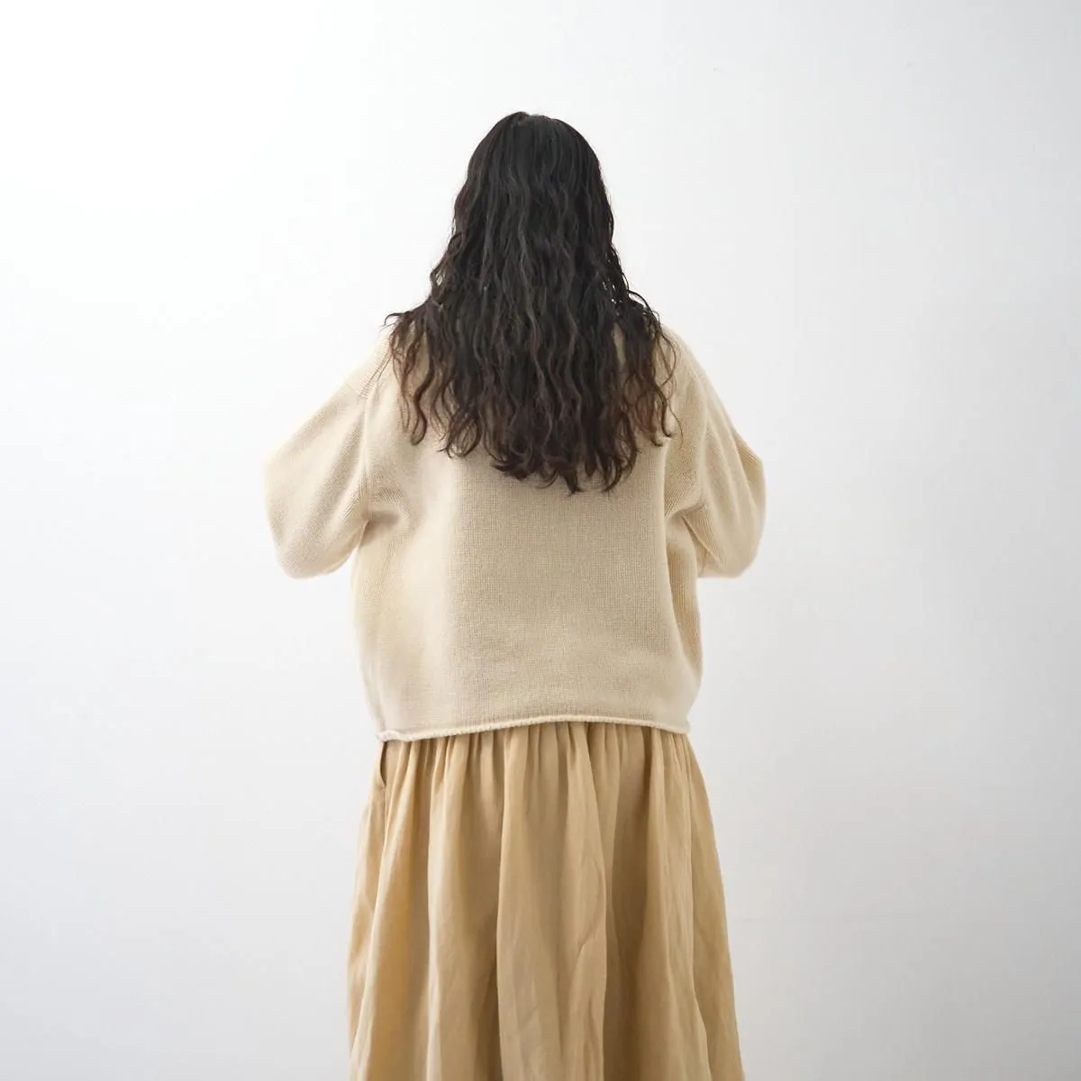ふんわりとした風合いと肌触りの良さをあわせ持つラムズウールを編み立てたローゲージニットウ〈 Rubin 〉。ふんわりとした風合いと肌触りの良さをあわせ持つラムズウールを編み立てたローゲージニットです。糸のふくらみを活かすように適度に目を詰めて編むことで、ほどよいボリュームと暖かさがあるものの、硬さはなく柔らかで軽い着心地を感じることができます。 袖や脇のラインを丸く仕上げたユニークなシルエットがたおやかな印象で、ゆったりとした身幅と短めの丈は着る人の体型や合わせるボトムスを選びません。程よい開きのクルーネックで一枚でも着やすいデザインですが、首回りや裾にはリブがなく、タートルネックの上からでも綺麗に重ねられ、さまざまな着こなしが楽しめます。 シンプルで秋冬シーズンの日常着として活躍するプルオーバーニットですが、ベーシックなセーターとは一線を画した、アトリエ・ダンタンらしい着る人の個性を引き出してくれる一枚です。(オフィシャル引用) size:F 着丈56cm/身幅61cm/肩幅50cm/袖丈45cm ※サイズ計測の多少の誤差はご了承下さい。 color : NATURAL,D.GRAY,BLACK material:Wool 100% model:168cm 着用アイテム シャツ:Gide Cotton Shirt パンツ:Leger Wool Pants ベスト:dieci別注 Greco Wool Vest お取り扱い店舗・・・dieci kyutaro店2F ------------------------------------------------------ Atelier d'antan|アトリエ ダンタン フランス語で『古き良き、往年の麻』を意味するブランドAtelier d'antan(アトリエ・ダンタン)時を経ても変わることの無い上質な素材というテーマを中心に、年齢や体型にとらわれない、どんな人も自分らしいお洒落を楽しんで欲しいという思いが込められたお洋服をつくられています。 size_chart
