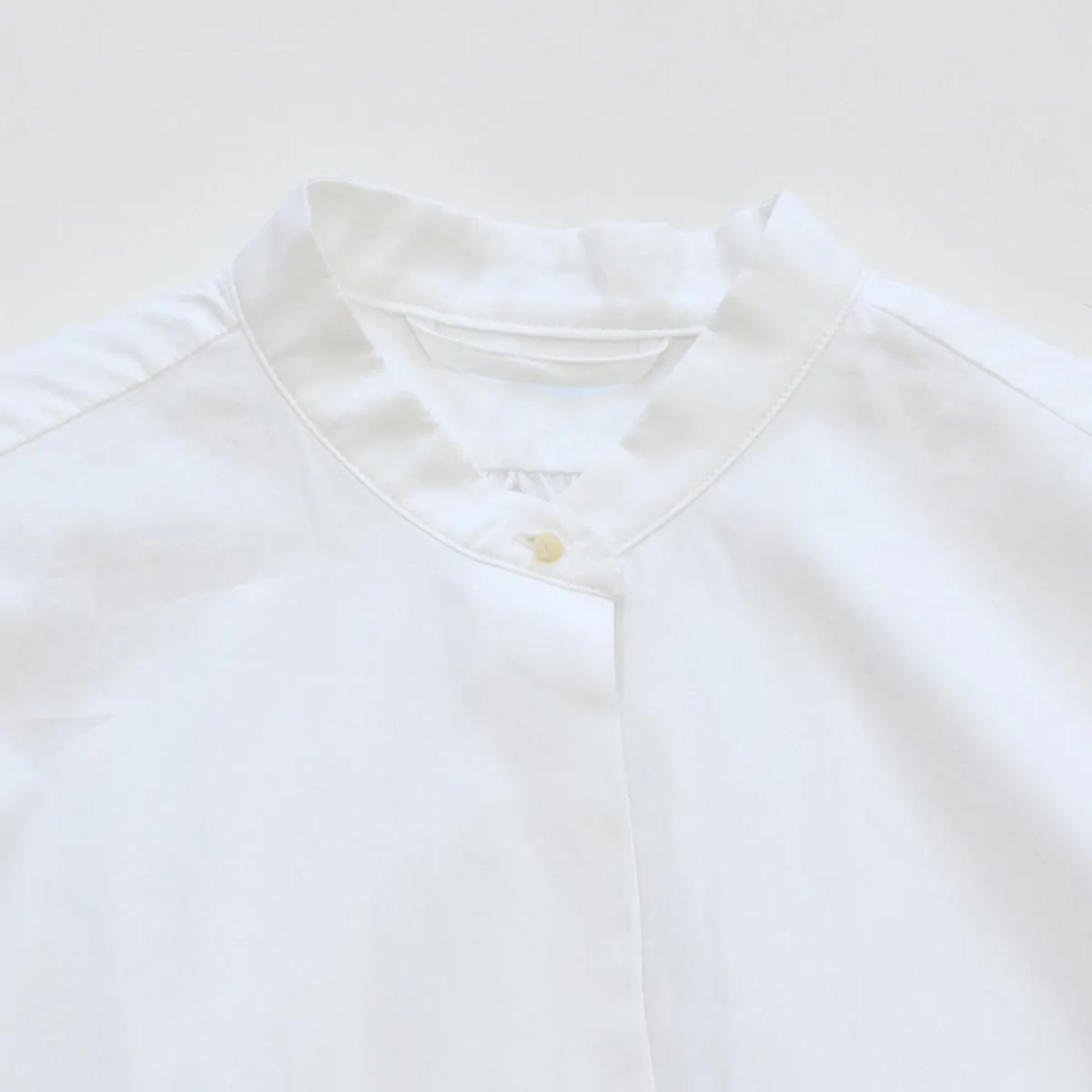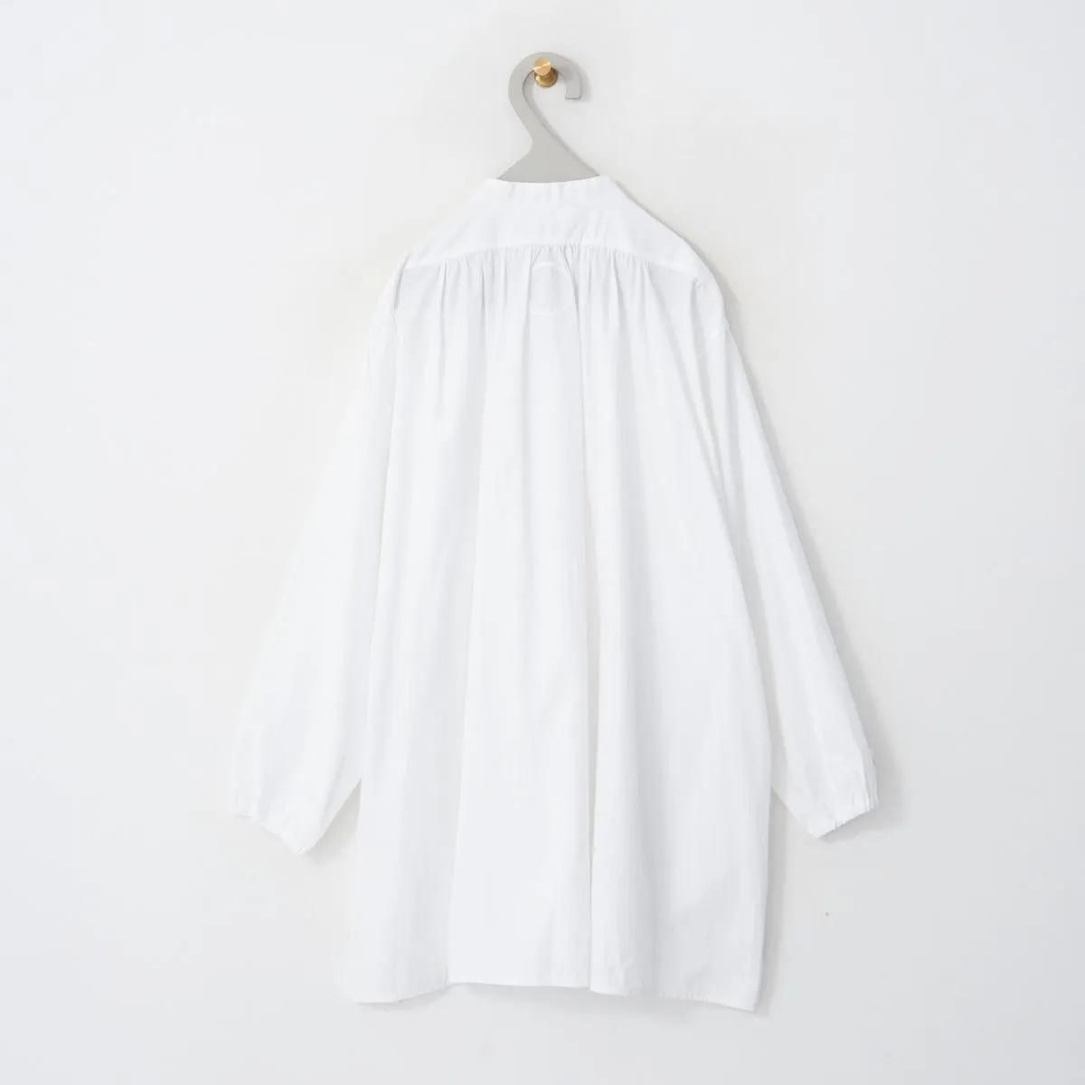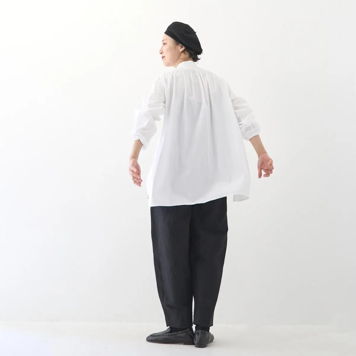 シンプルでカジュアルにも使いやすいスタンドカラーのデザインですが、比翼仕立てがきちんとした印象で品良く着られる一枚。パールのように真ん丸な襟元のボタンには、フランスの貴重なデッドストックの貝ボタンが使われており、後ろが長い着丈や背中のギャザーなど、シルエットやディテールからもアンティークシャツのような佇まいが感じられます。ゴム仕様の袖口や両サイドのポケットなど機能性にも配慮したアトリエ・ダンタンの定番ブラウスです。