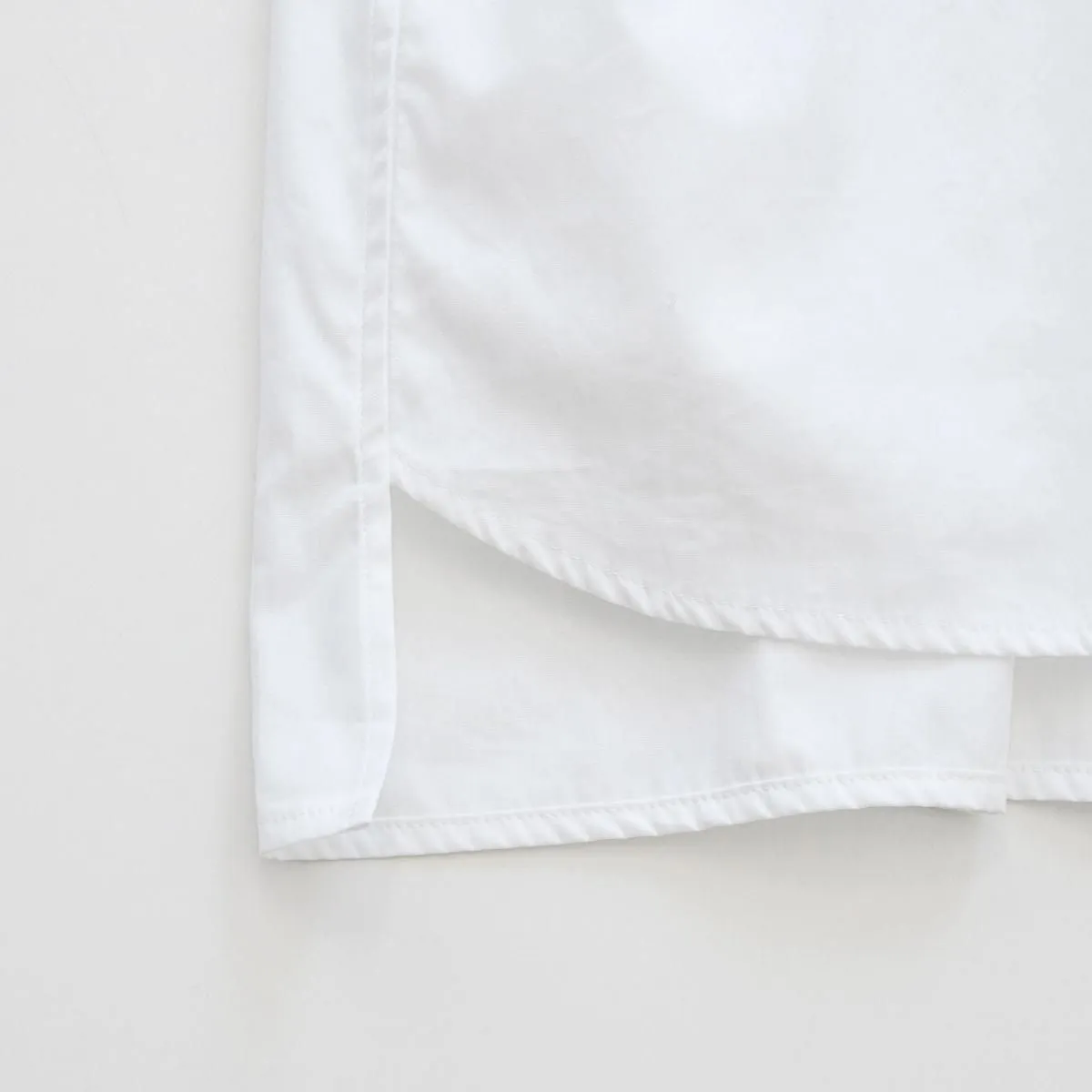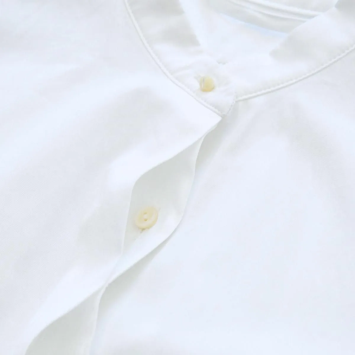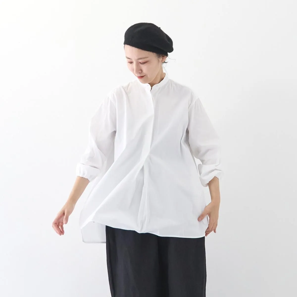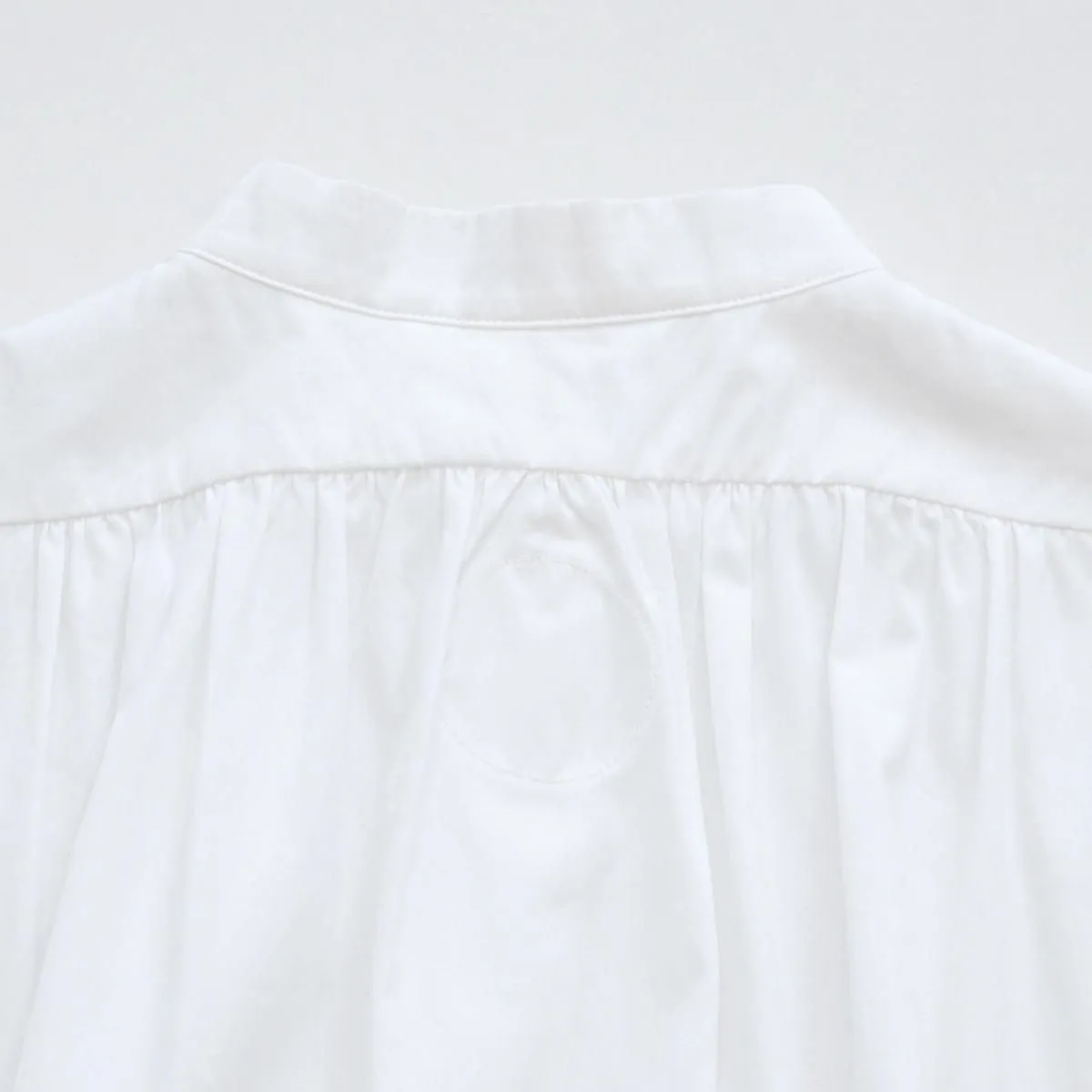 シンプルでカジュアルにも使いやすいスタンドカラーのデザインですが、比翼仕立てがきちんとした印象で品良く着られる一枚。パールのように真ん丸な襟元のボタンには、フランスの貴重なデッドストックの貝ボタンが使われており、後ろが長い着丈や背中のギャザーなど、シルエットやディテールからもアンティークシャツのような佇まいが感じられます。ゴム仕様の袖口や両サイドのポケットなど機能性にも配慮したアトリエ・ダンタンの定番ブラウスです。