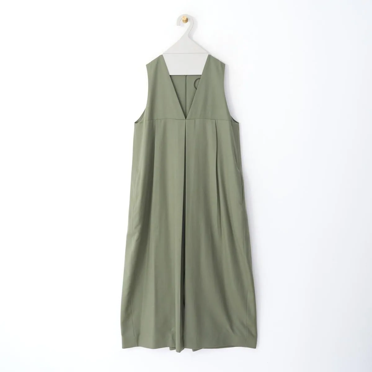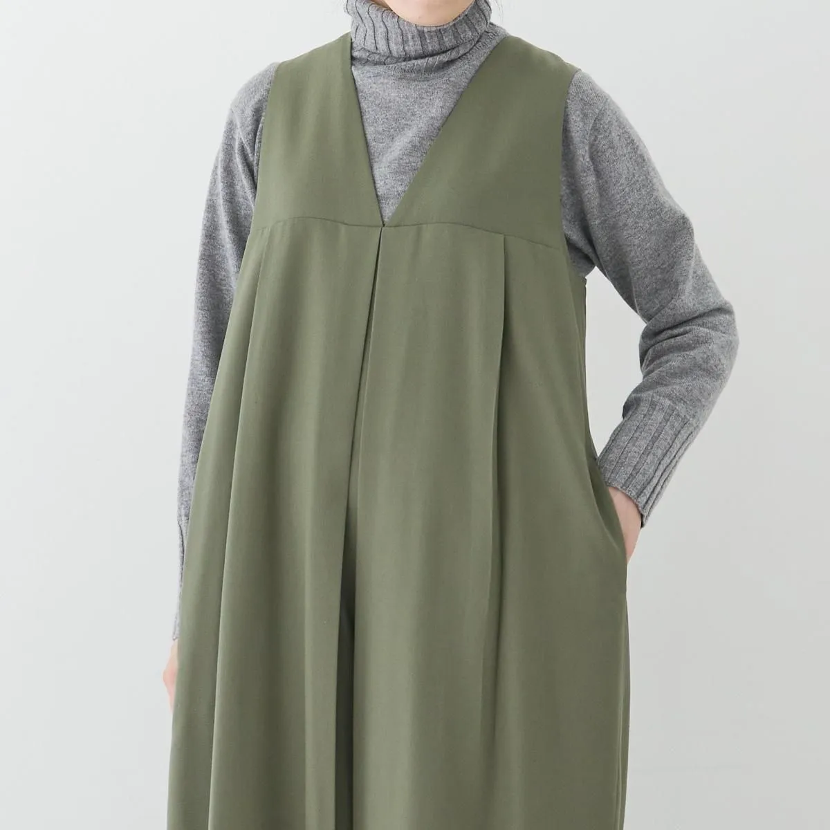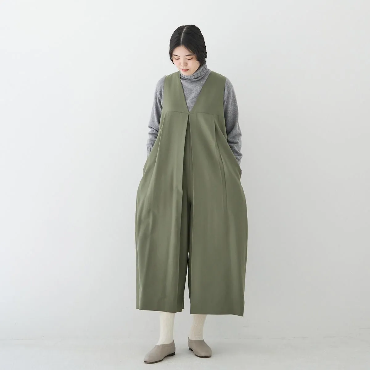 トップはベストのように、インナーとのコーディネートを楽しめるノースリーブのVネック。胸下の切り替えからボックスプリーツとタックが入り、ボリューム感がありながら、パンツ部分は裾に向かってゆるやかにテーパード。丸みのあるフェミニンなシルエットが印象的です。