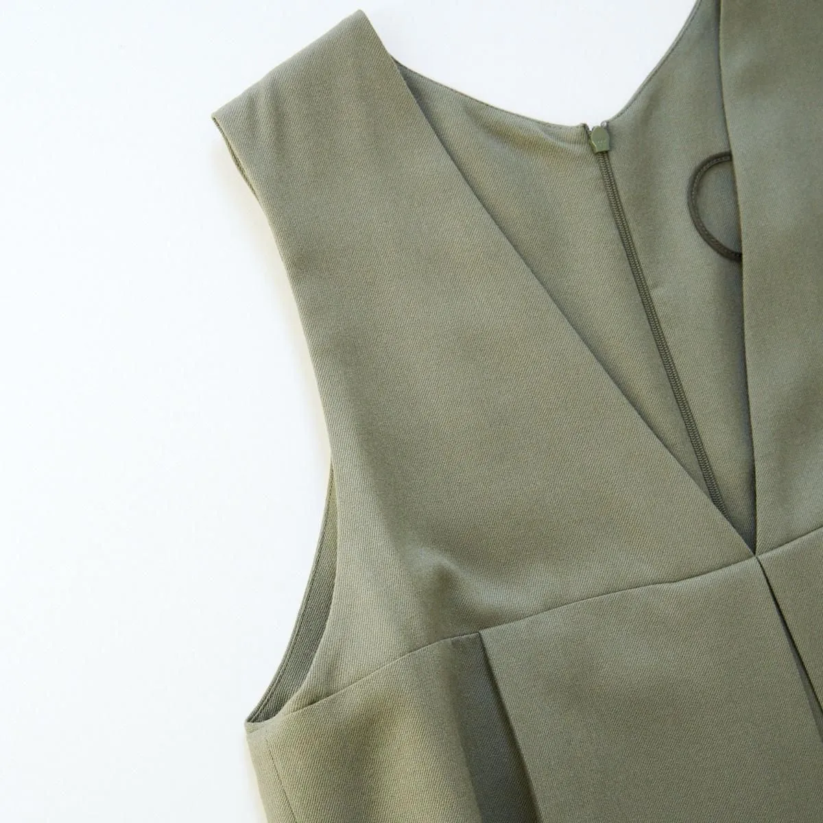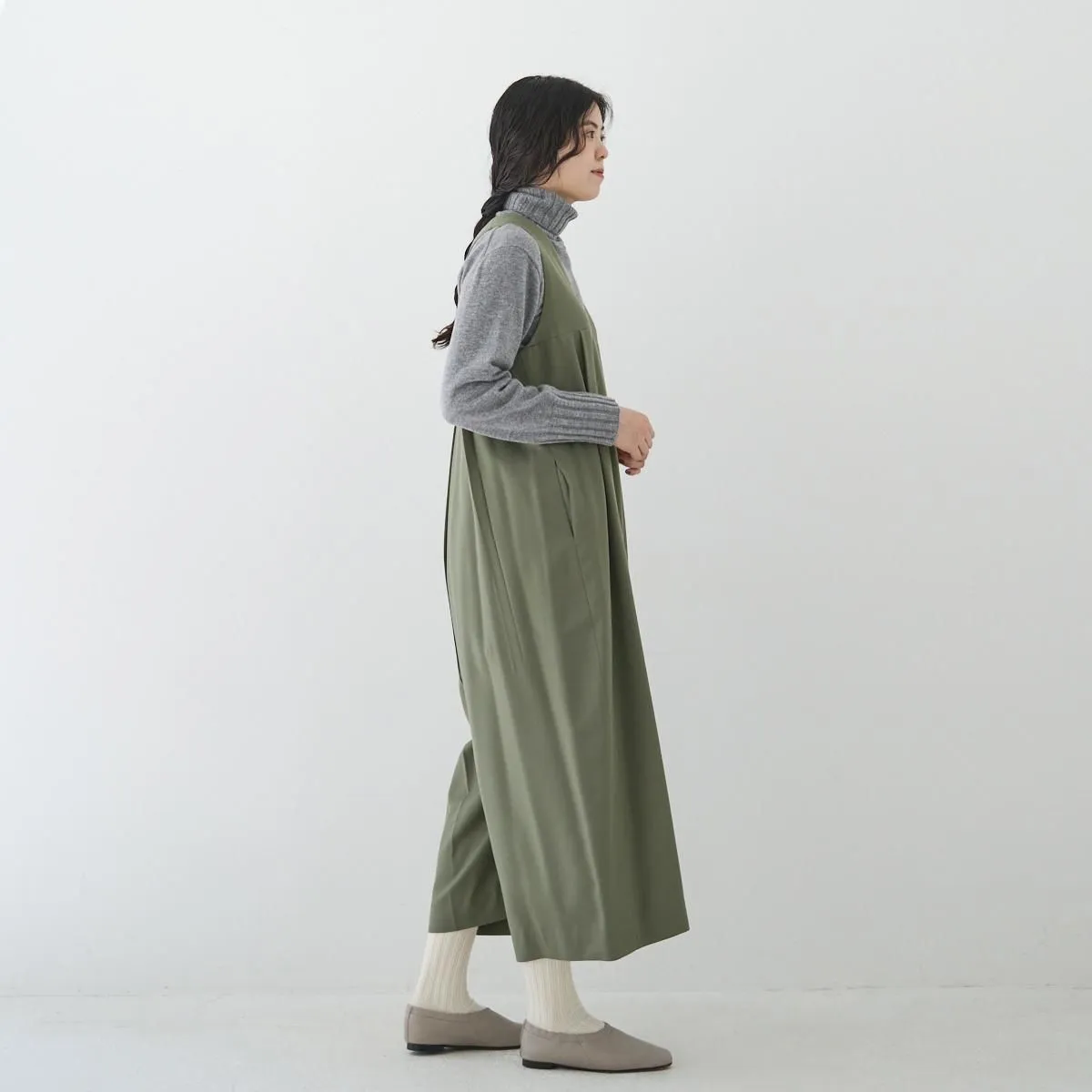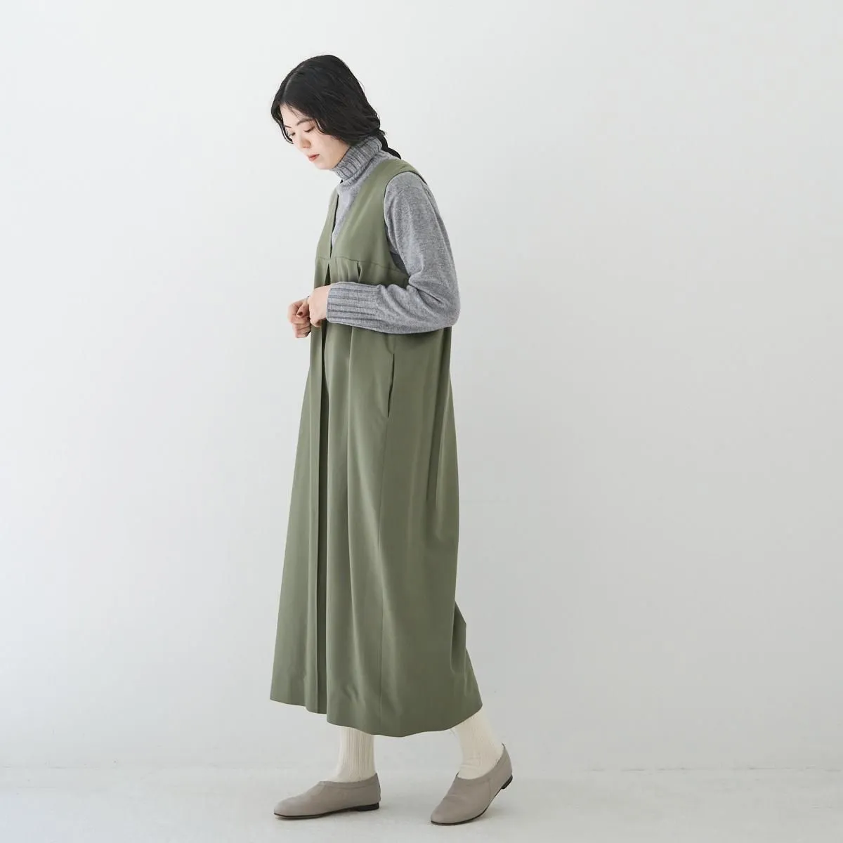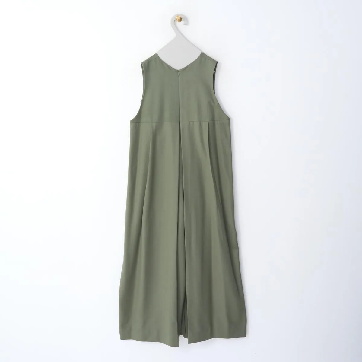 トップはベストのように、インナーとのコーディネートを楽しめるノースリーブのVネック。胸下の切り替えからボックスプリーツとタックが入り、ボリューム感がありながら、パンツ部分は裾に向かってゆるやかにテーパード。丸みのあるフェミニンなシルエットが印象的です。