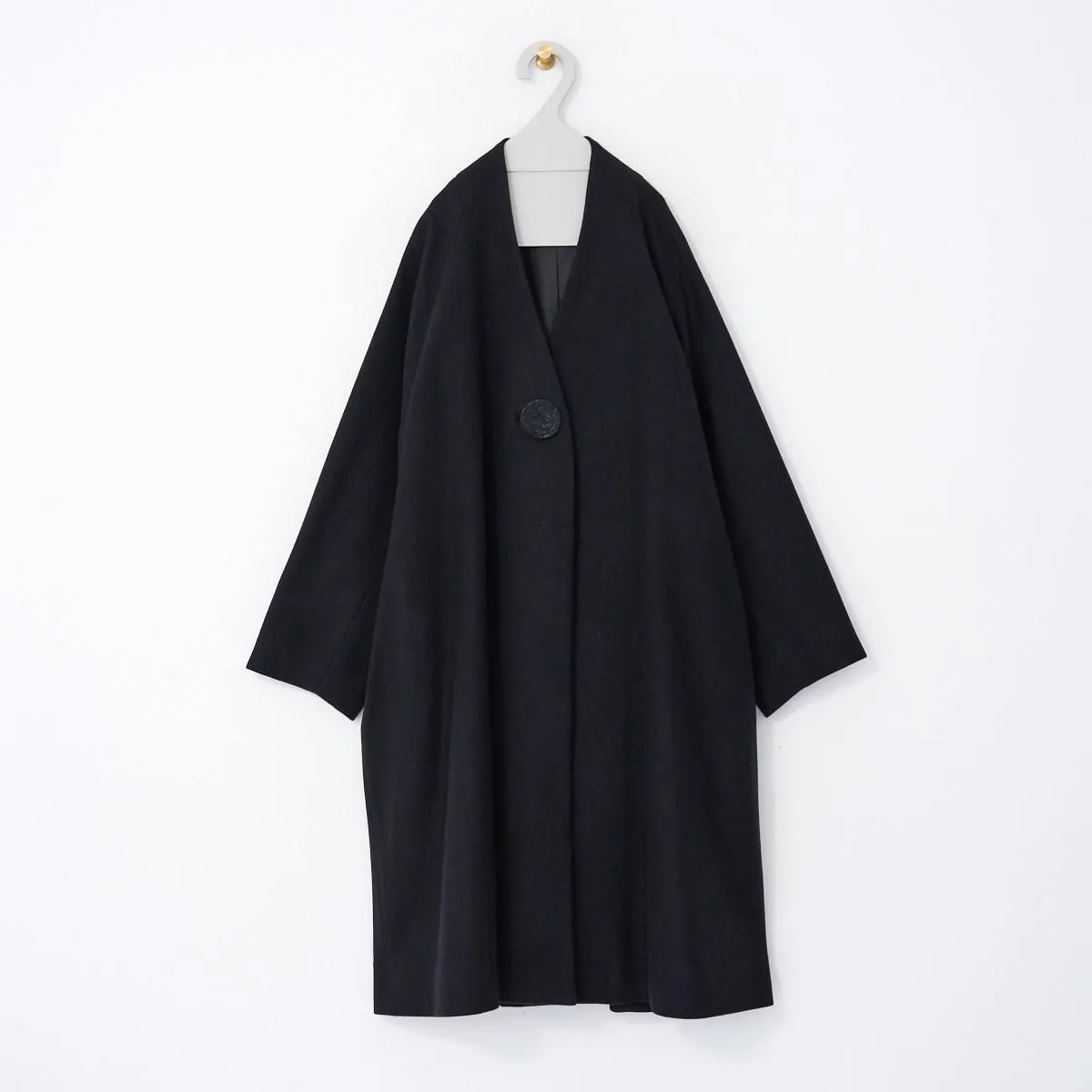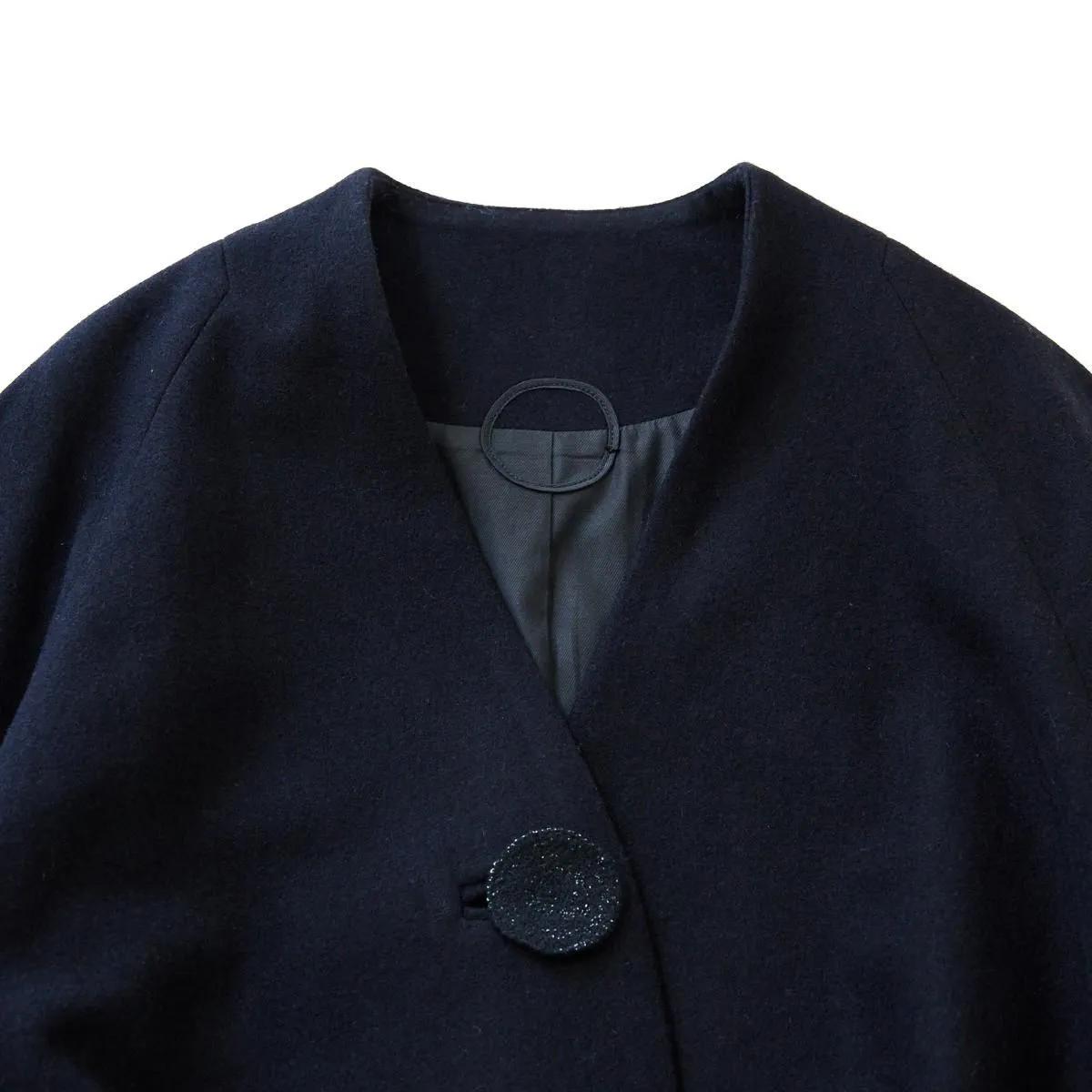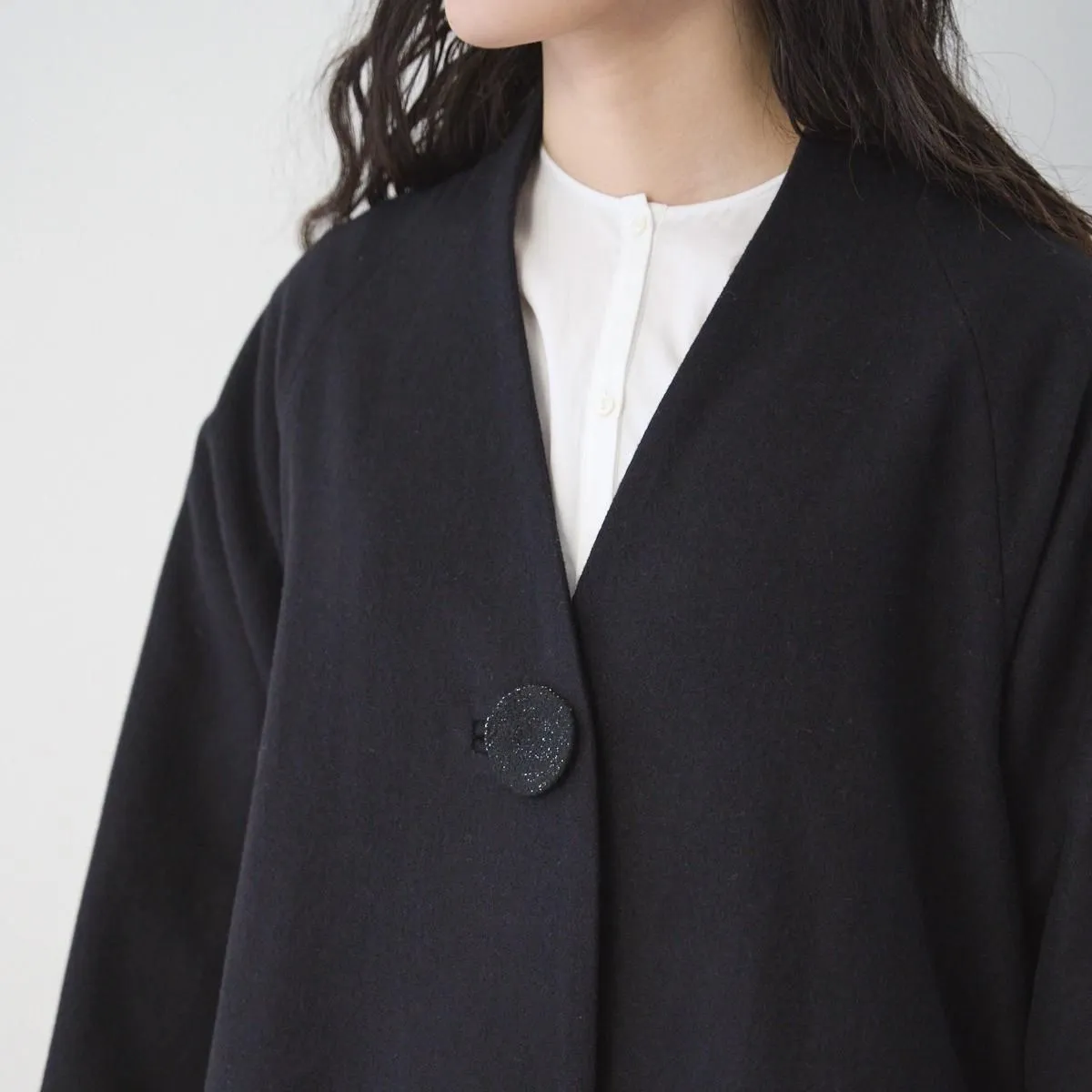 フロントには一際目を引く大きなボタンがアクセントに。作家さんが一点一点、丁寧に制作したボタンです。両サイドにはスリットポケットがついています。ボトムスとのバランスがとりやすい丈感で、冬のコーディネートが楽しくなる一枚です。