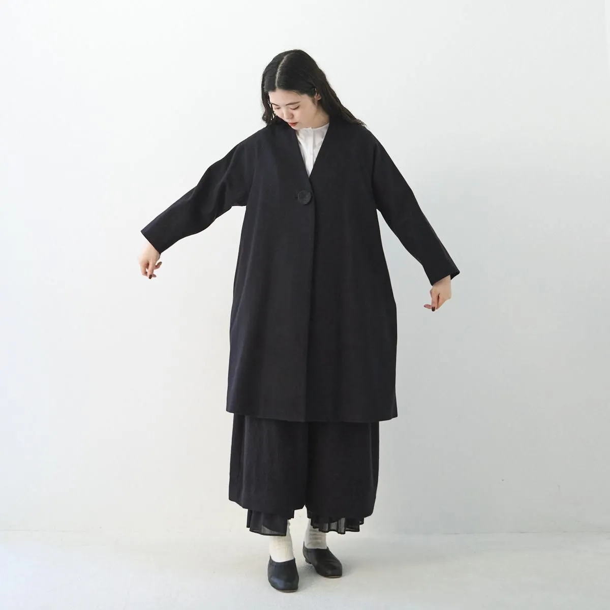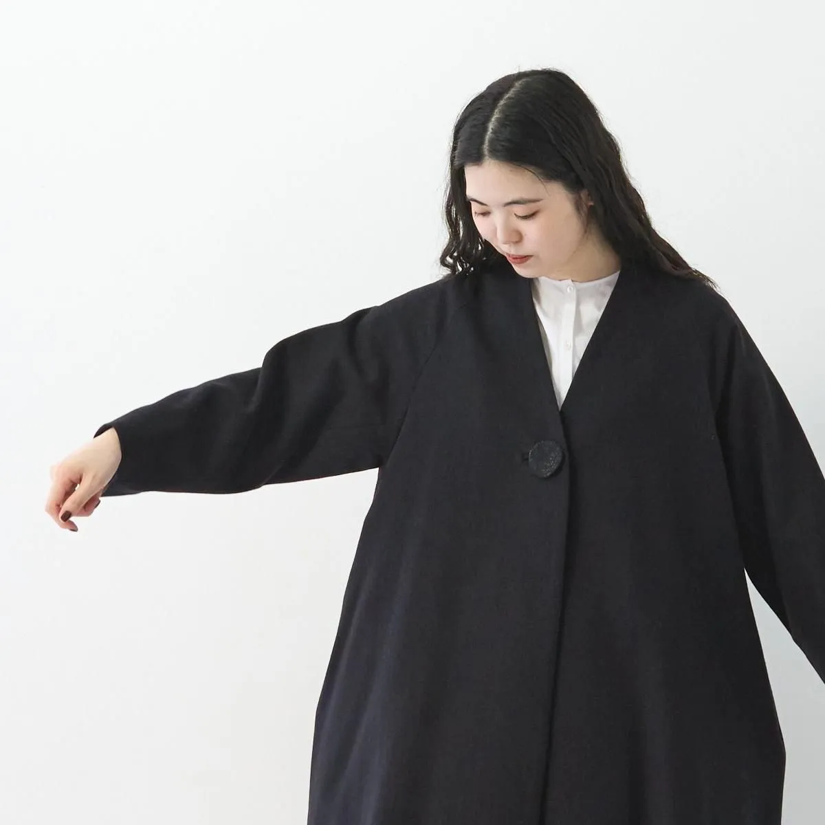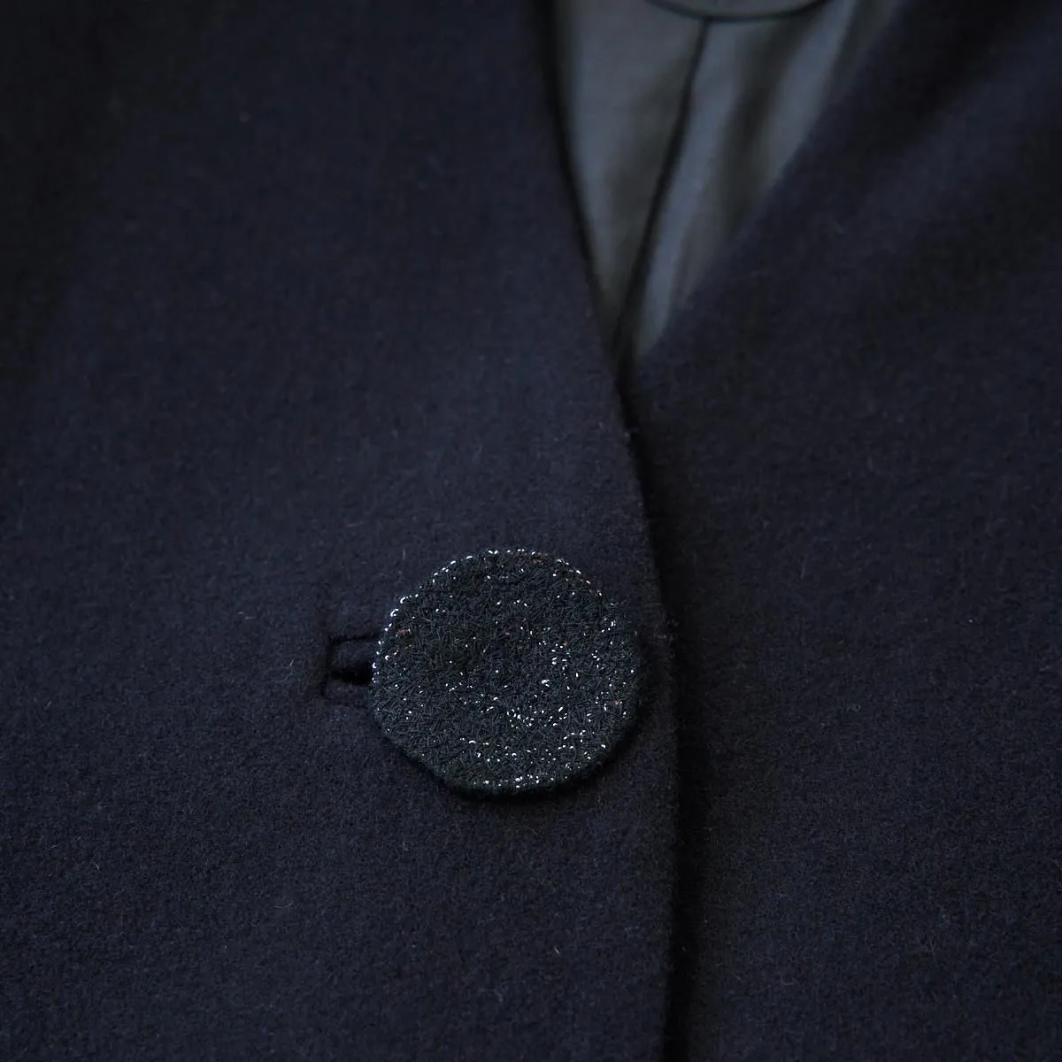 フロントには一際目を引く大きなボタンがアクセントに。作家さんが一点一点、丁寧に制作したボタンです。両サイドにはスリットポケットがついています。ボトムスとのバランスがとりやすい丈感で、冬のコーディネートが楽しくなる一枚です。