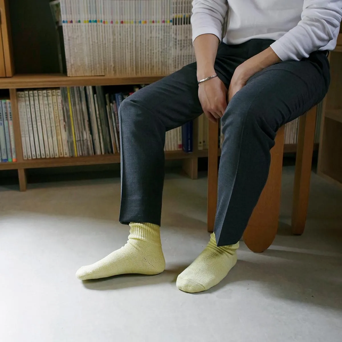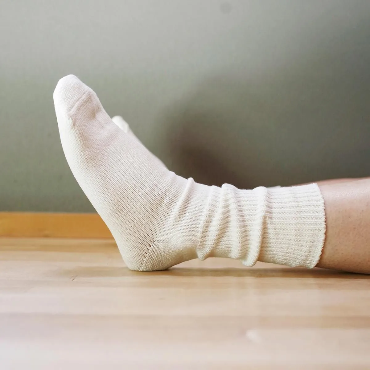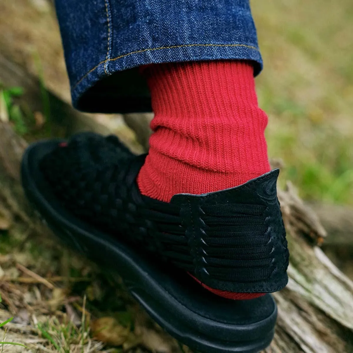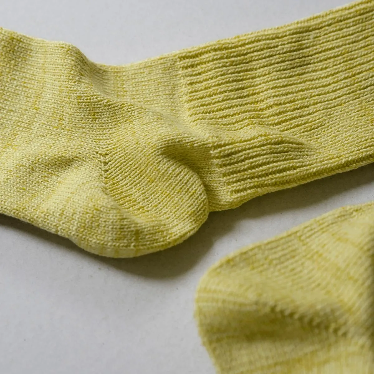 幅広に編めるローゲージの編み機を使用し、履き口のゴムをできるだけ減らして仕上げています。