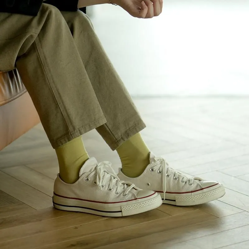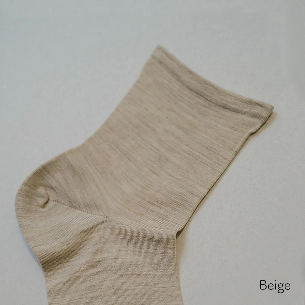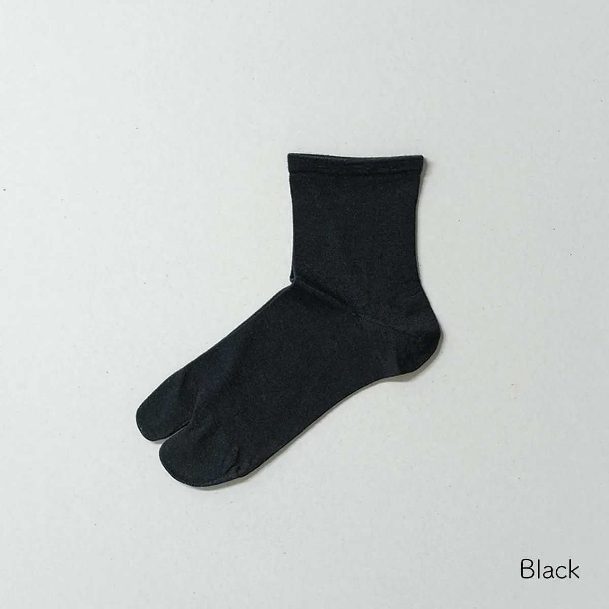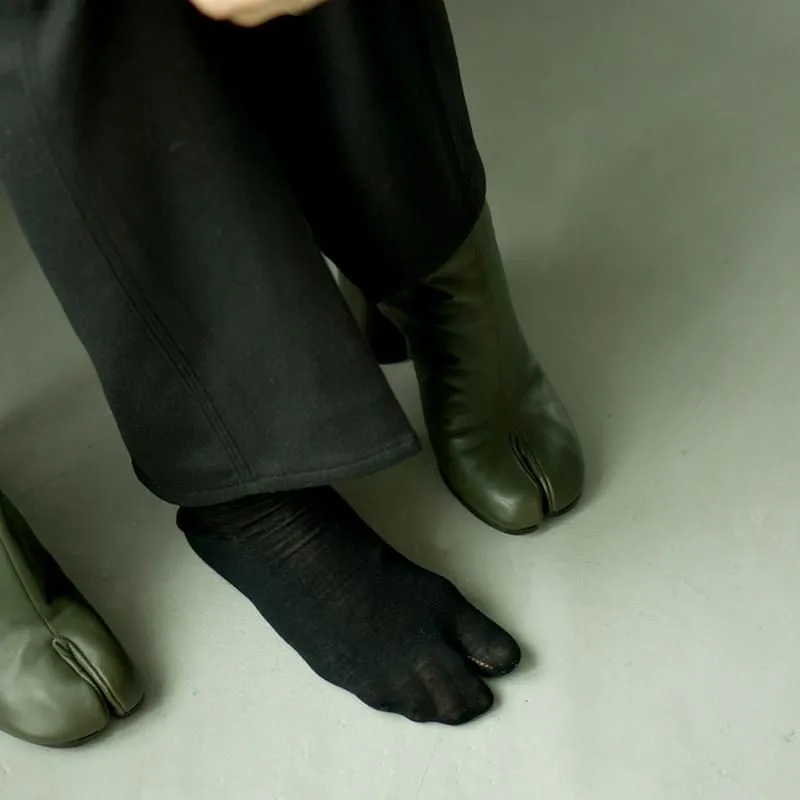 ハイゲージの編み機で薄手に編み立てているため、季節を問わず心地よくお使いいただける一足です。