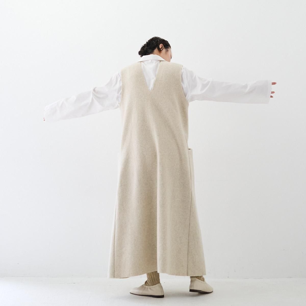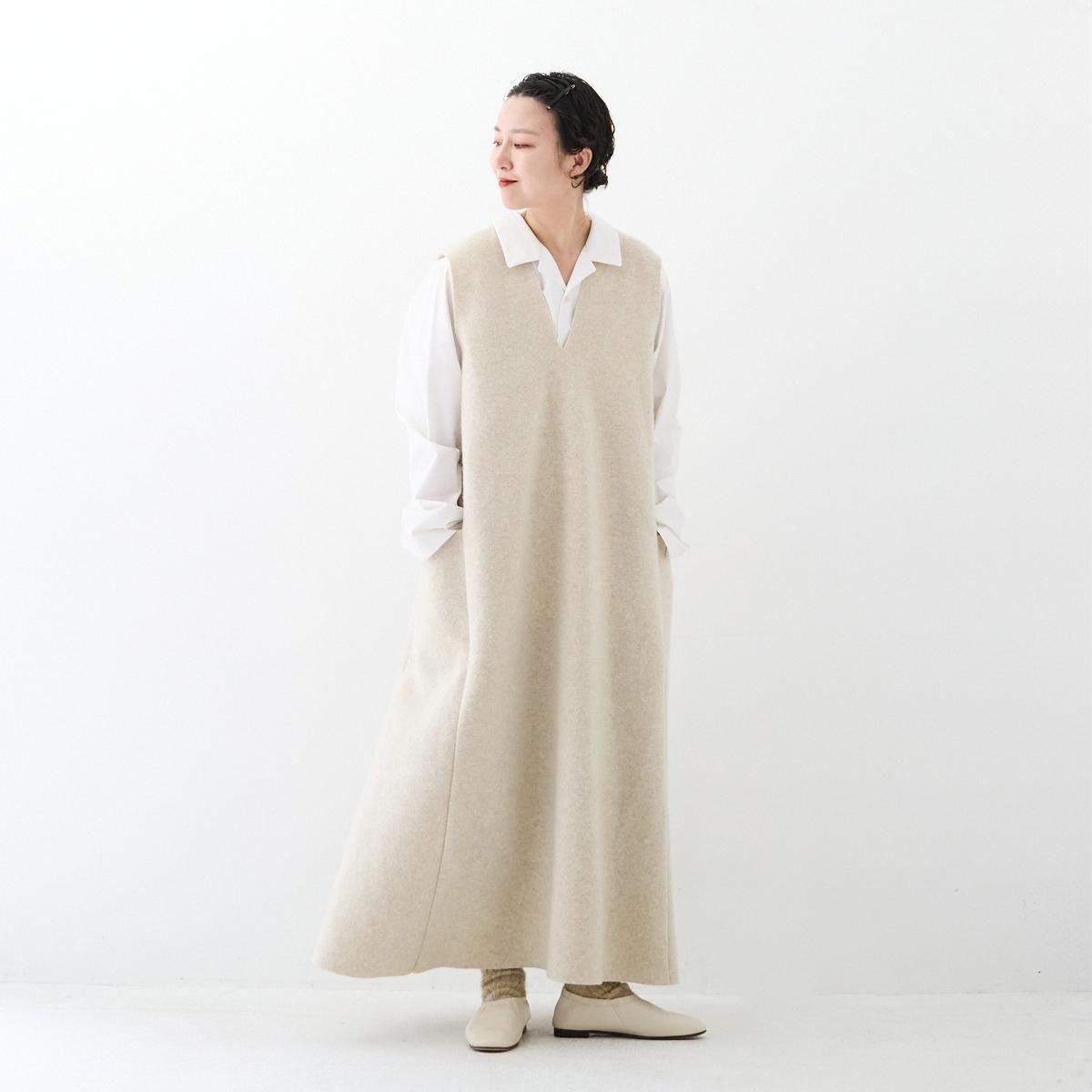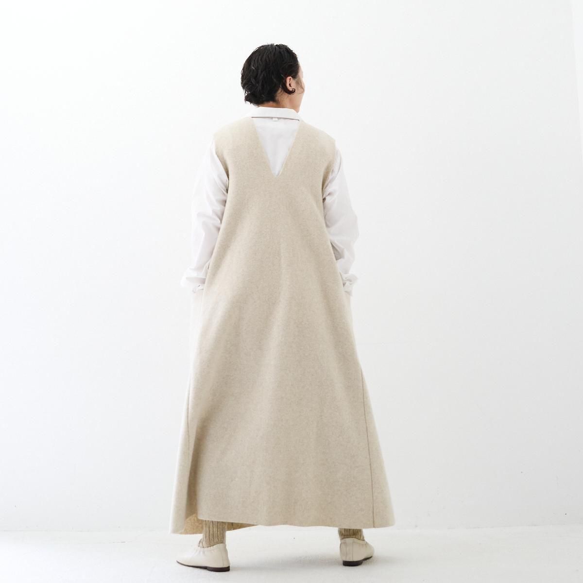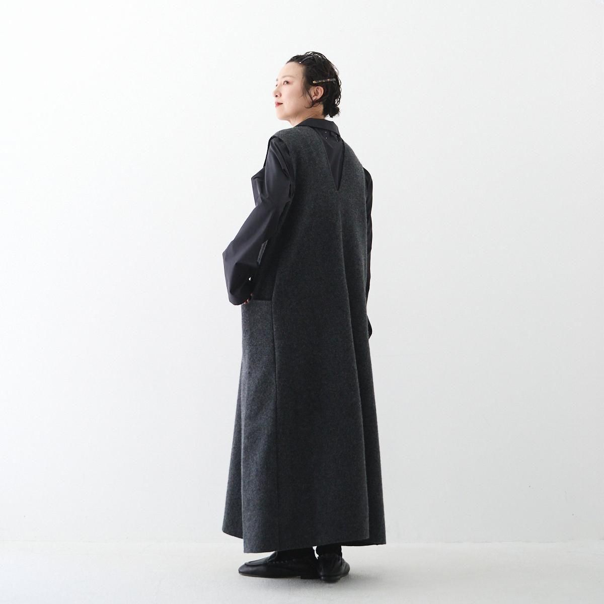 フェルトの特性を活かし断ち切りで仕上げた仕立ての美しさが目を惹きます。フロントとバックのVネックから、裾に向けて広がりのあるAラインのシルエットで、女性らしい滑らかなドレープが生まれています。