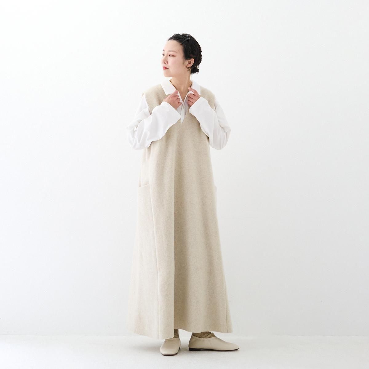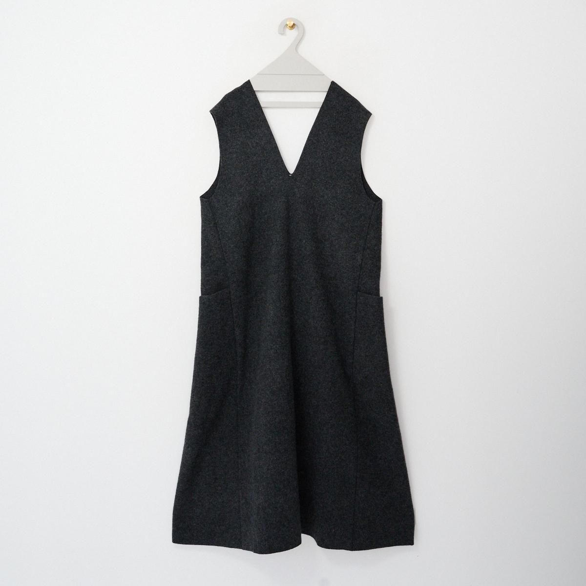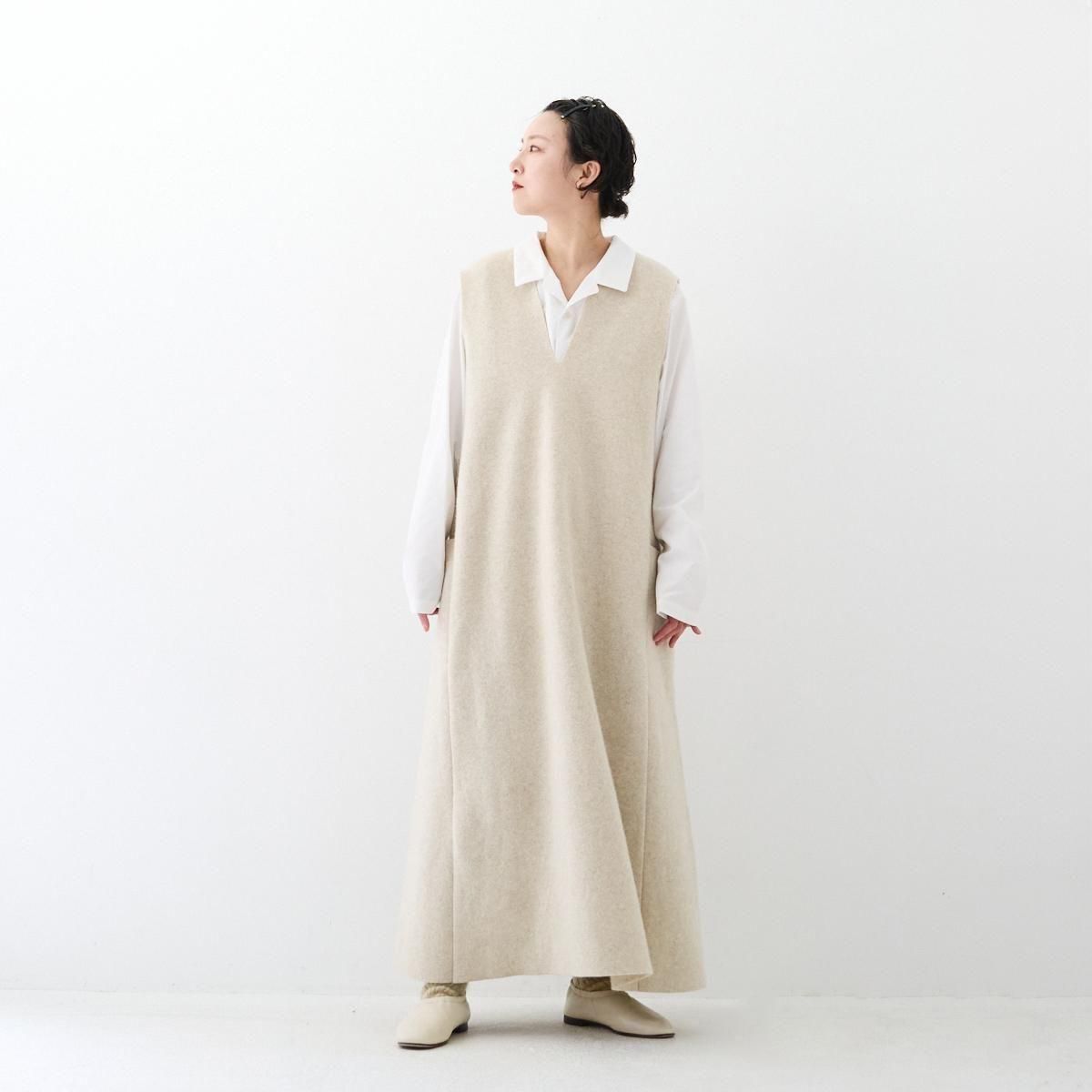 フェルトの特性を活かし断ち切りで仕上げた仕立ての美しさが目を惹きます。フロントとバックのVネックから、裾に向けて広がりのあるAラインのシルエットで、女性らしい滑らかなドレープが生まれています。