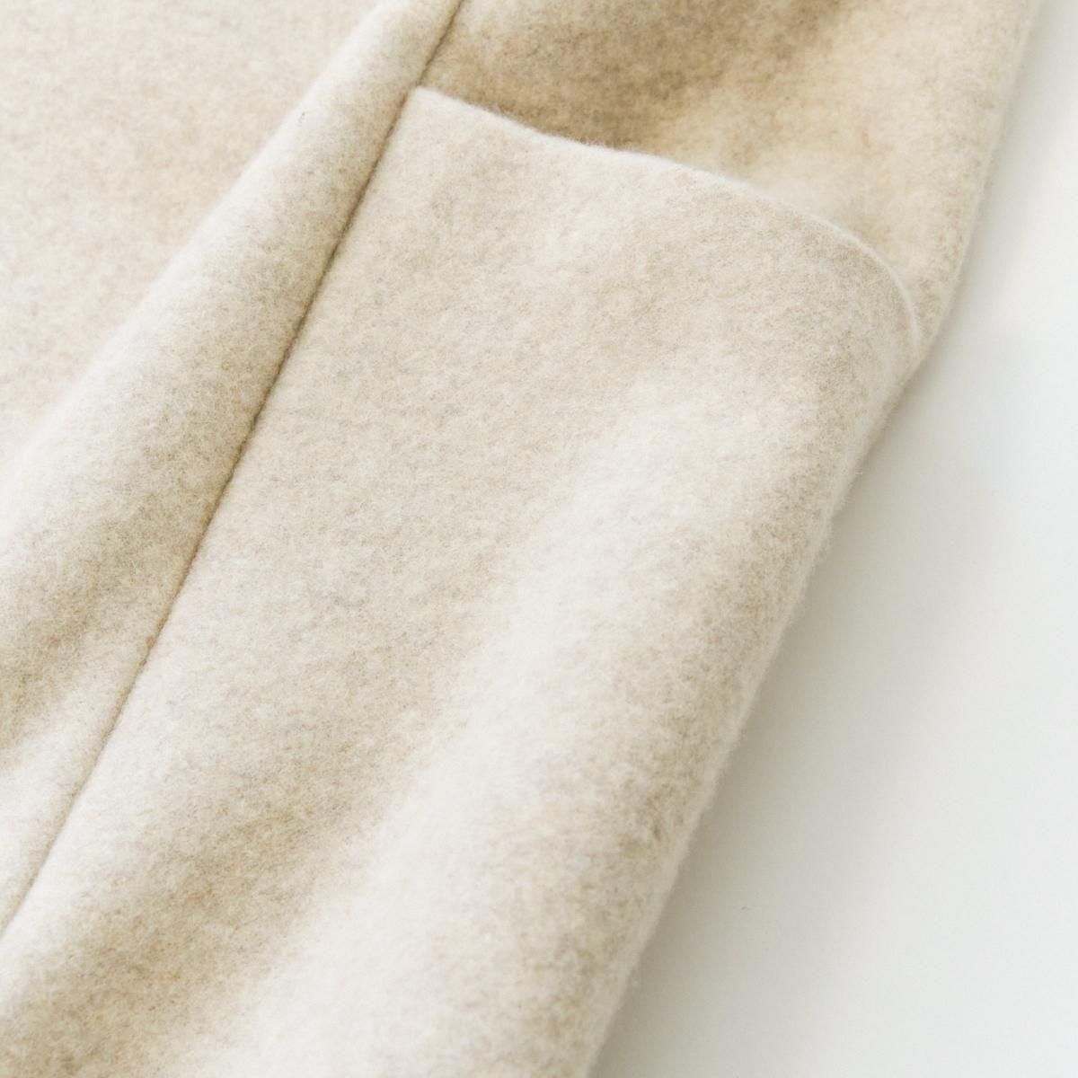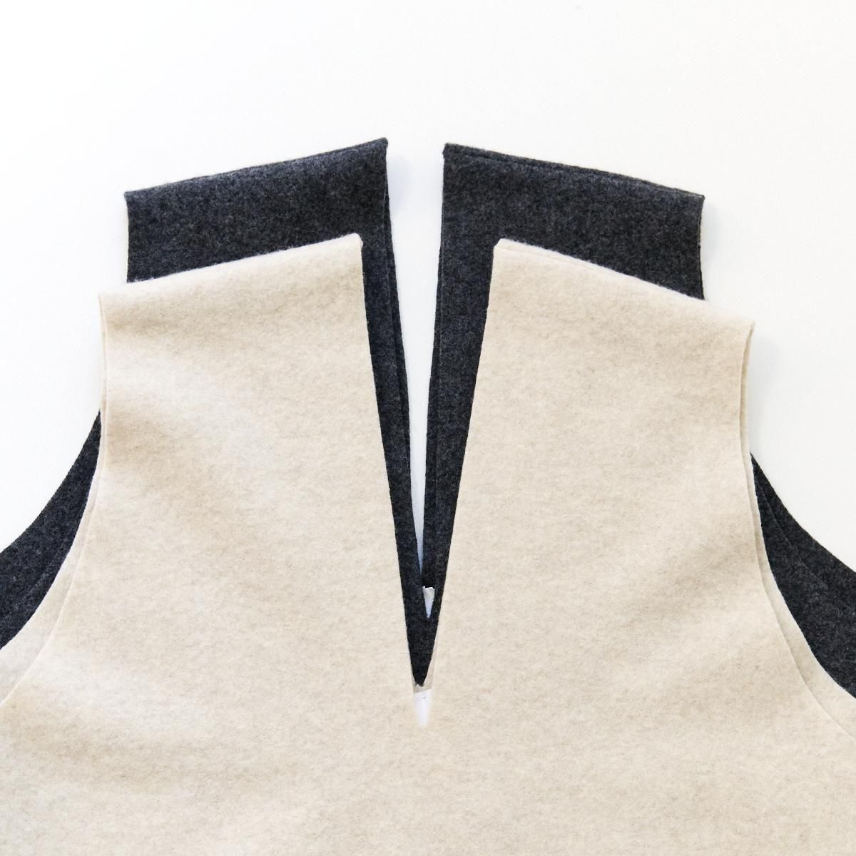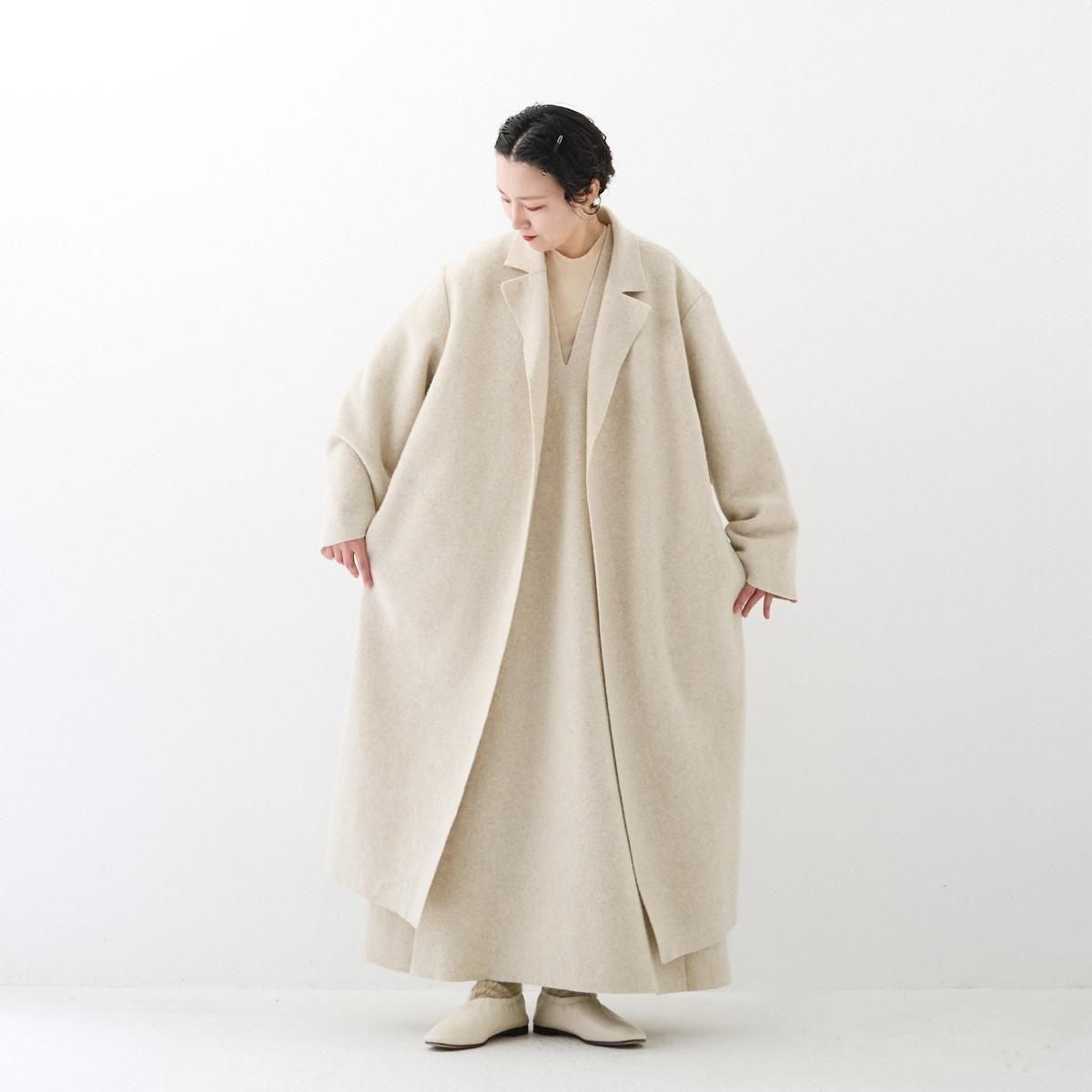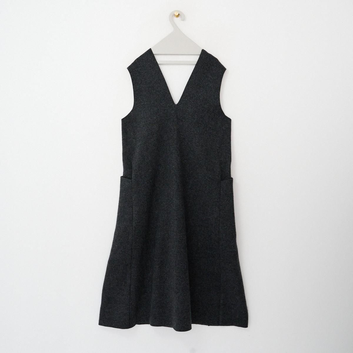 フェルトの特性を活かし断ち切りで仕上げた仕立ての美しさが目を惹きます。フロントとバックのVネックから、裾に向けて広がりのあるAラインのシルエットで、女性らしい滑らかなドレープが生まれています。