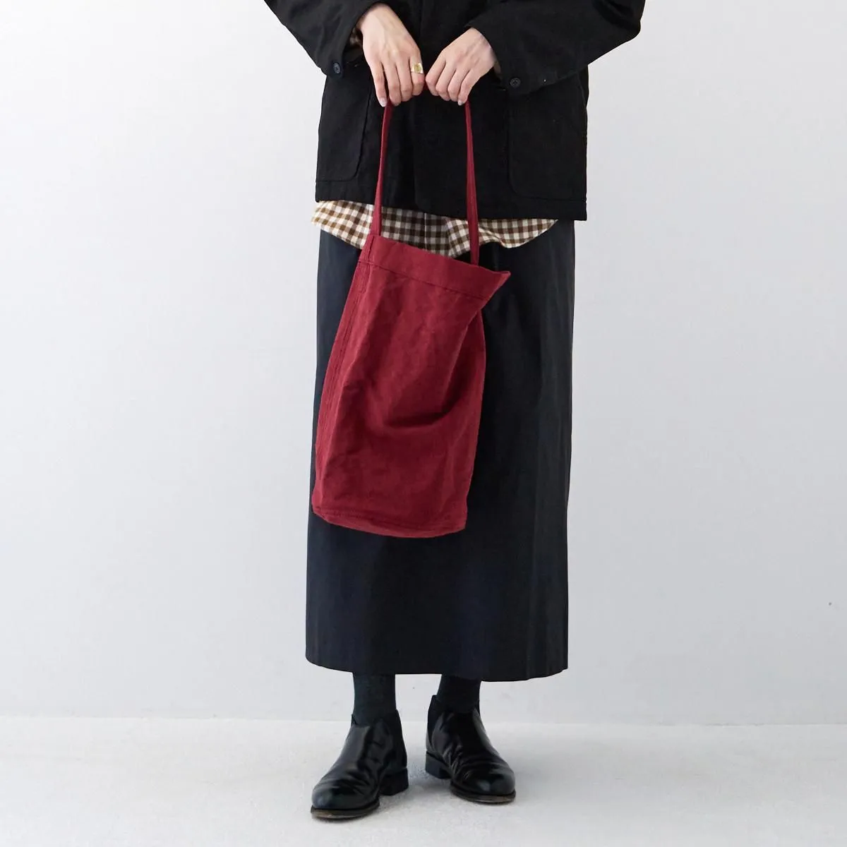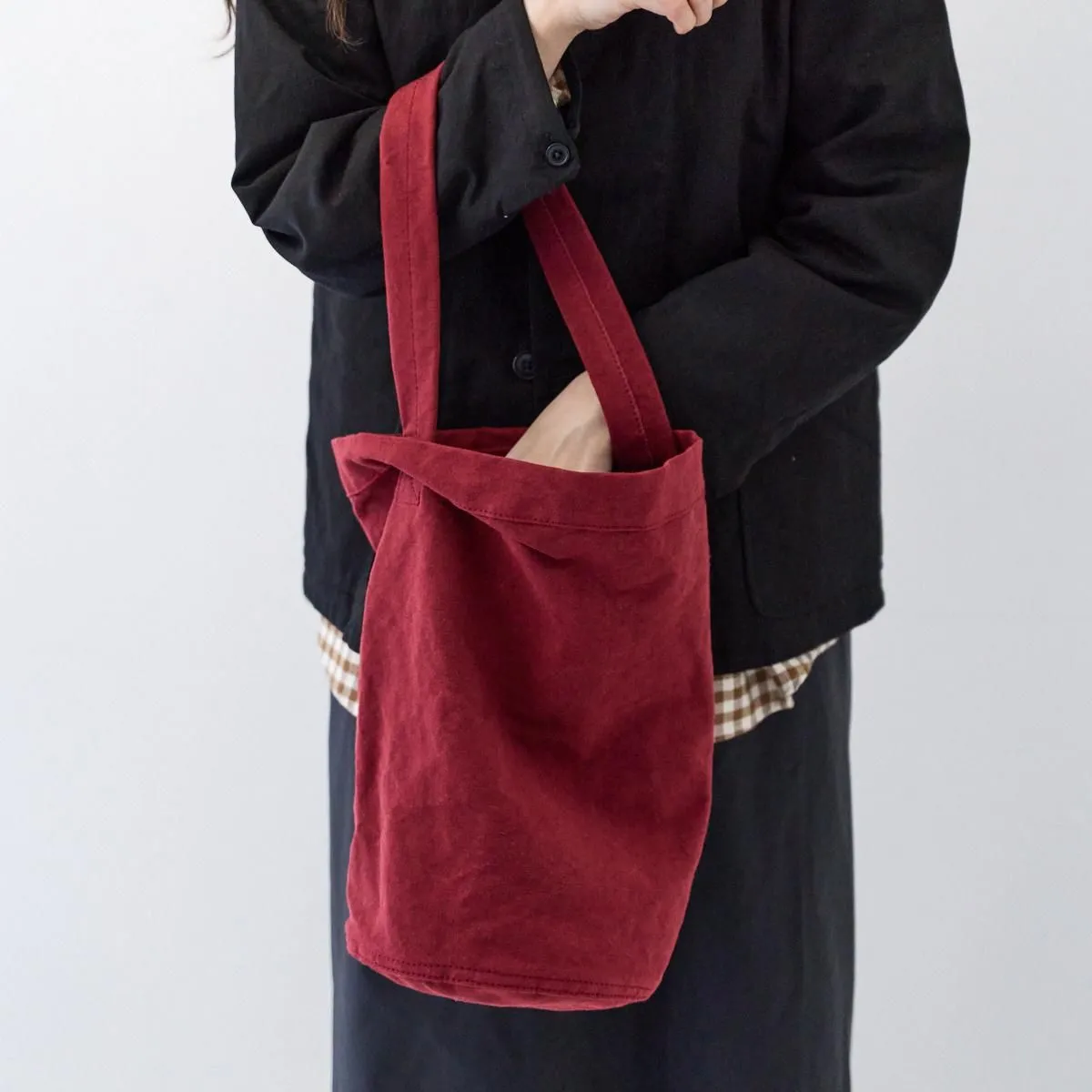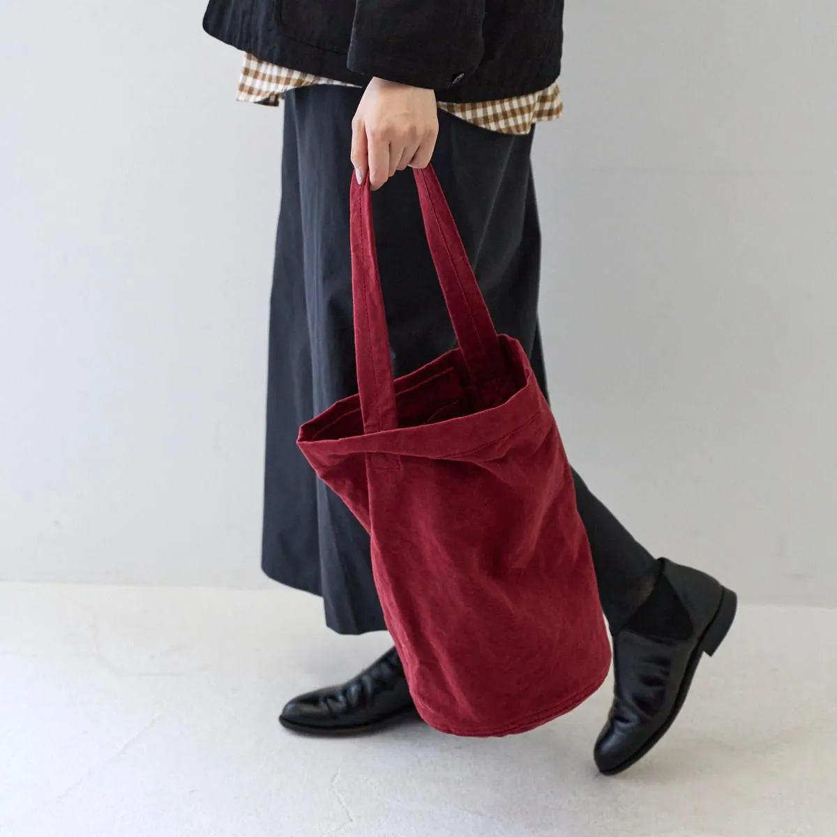 深みのある赤は使い込むごとに経年変化を楽しめる色合いです。コットンリネンはキャンバス地のバッグに比べ軽量で雰囲気のある素材なので、カジュアルになり過ぎず着こなしにアクセントを加えてくれます。