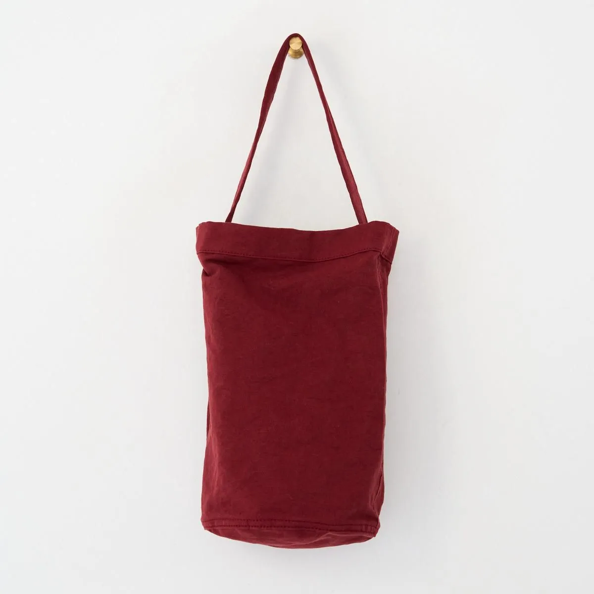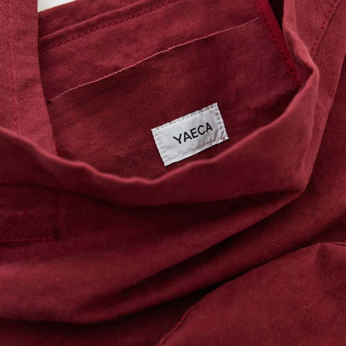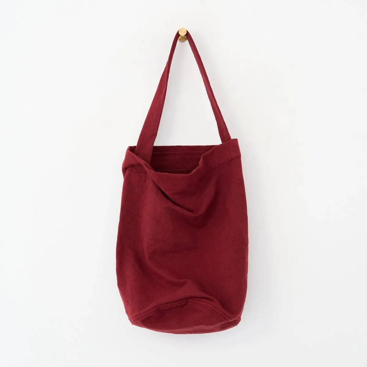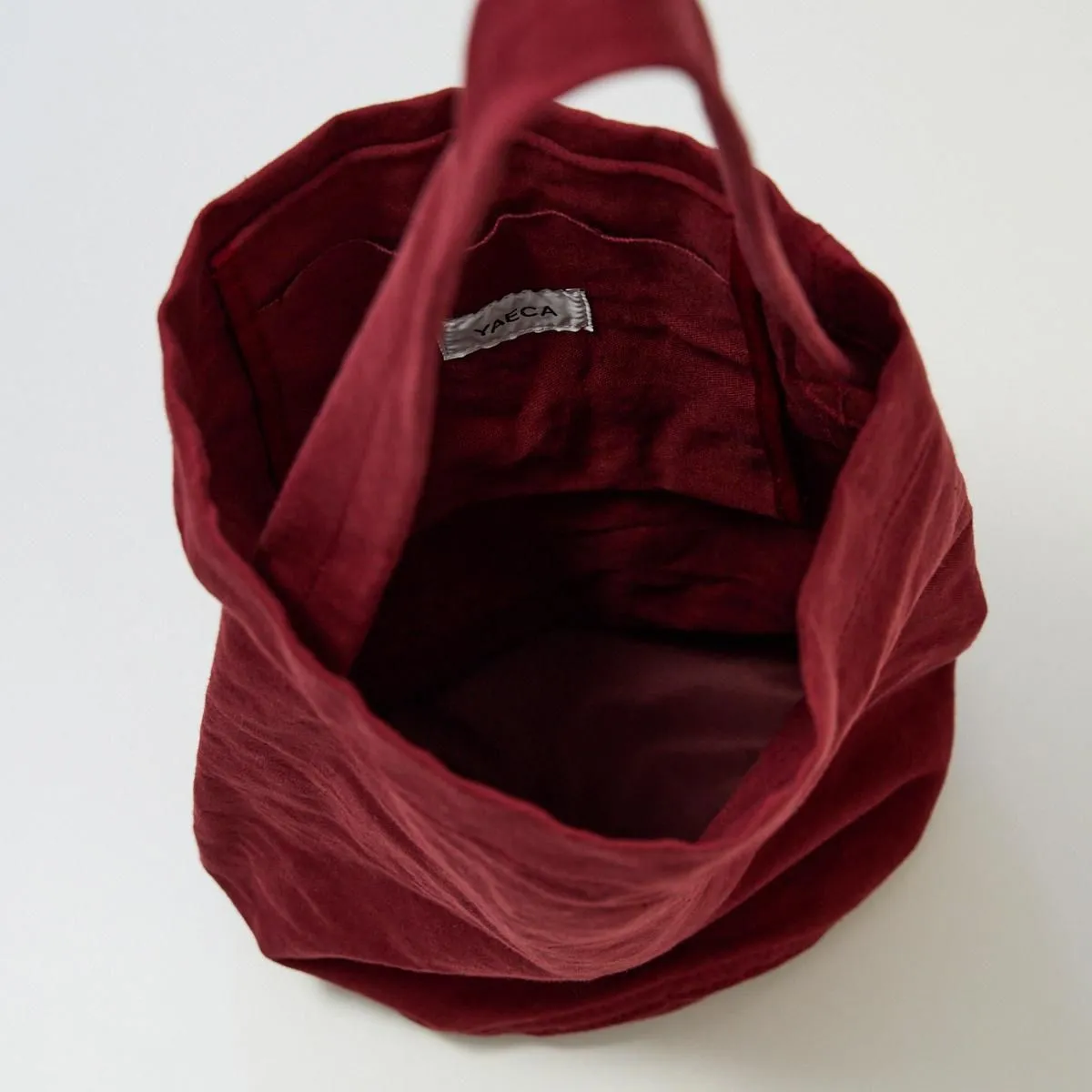 深みのある赤は使い込むごとに経年変化を楽しめる色合いです。コットンリネンはキャンバス地のバッグに比べ軽量で雰囲気のある素材なので、カジュアルになり過ぎず着こなしにアクセントを加えてくれます。
