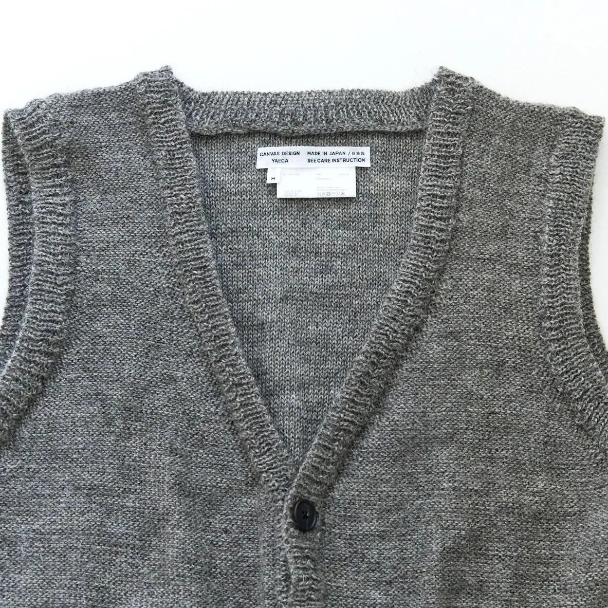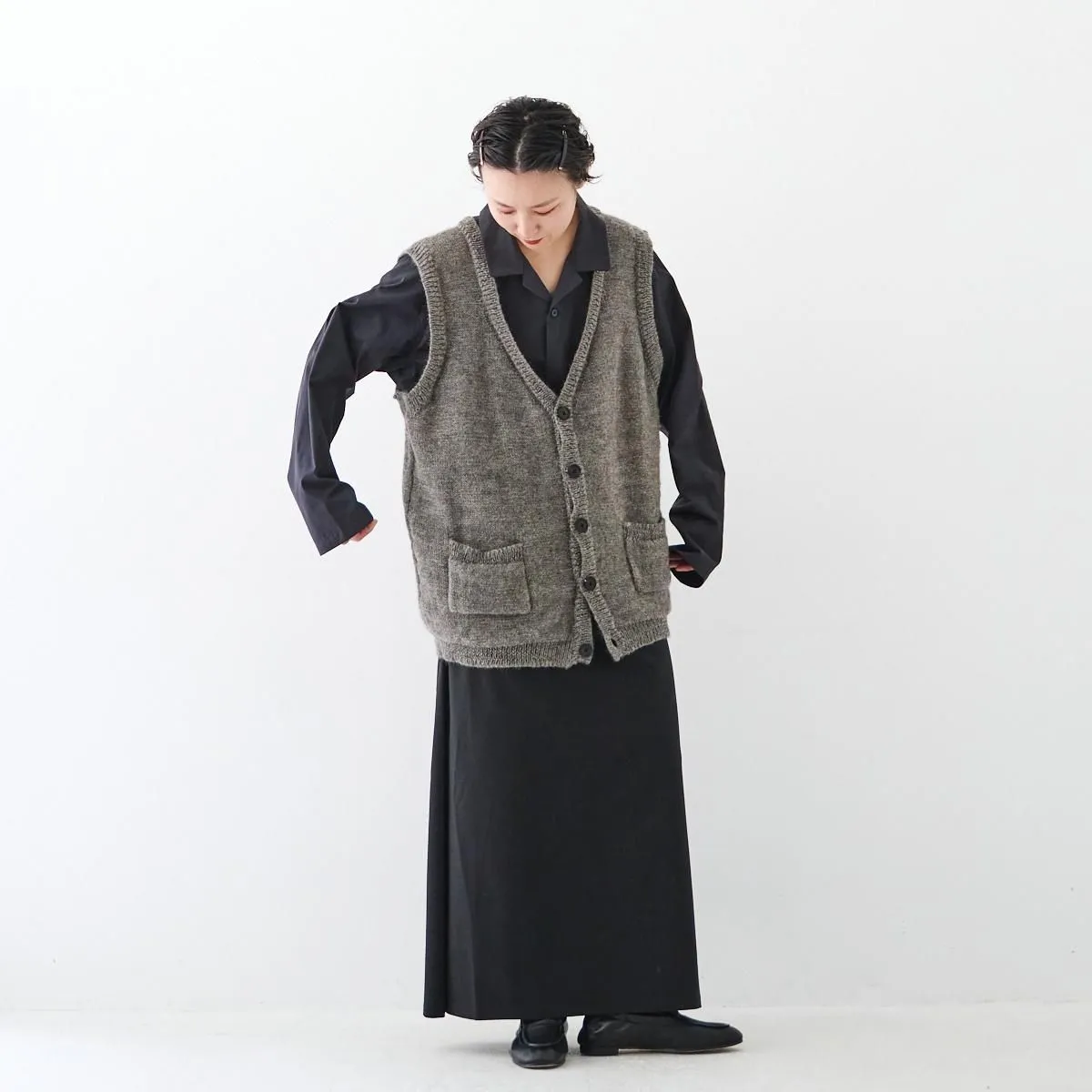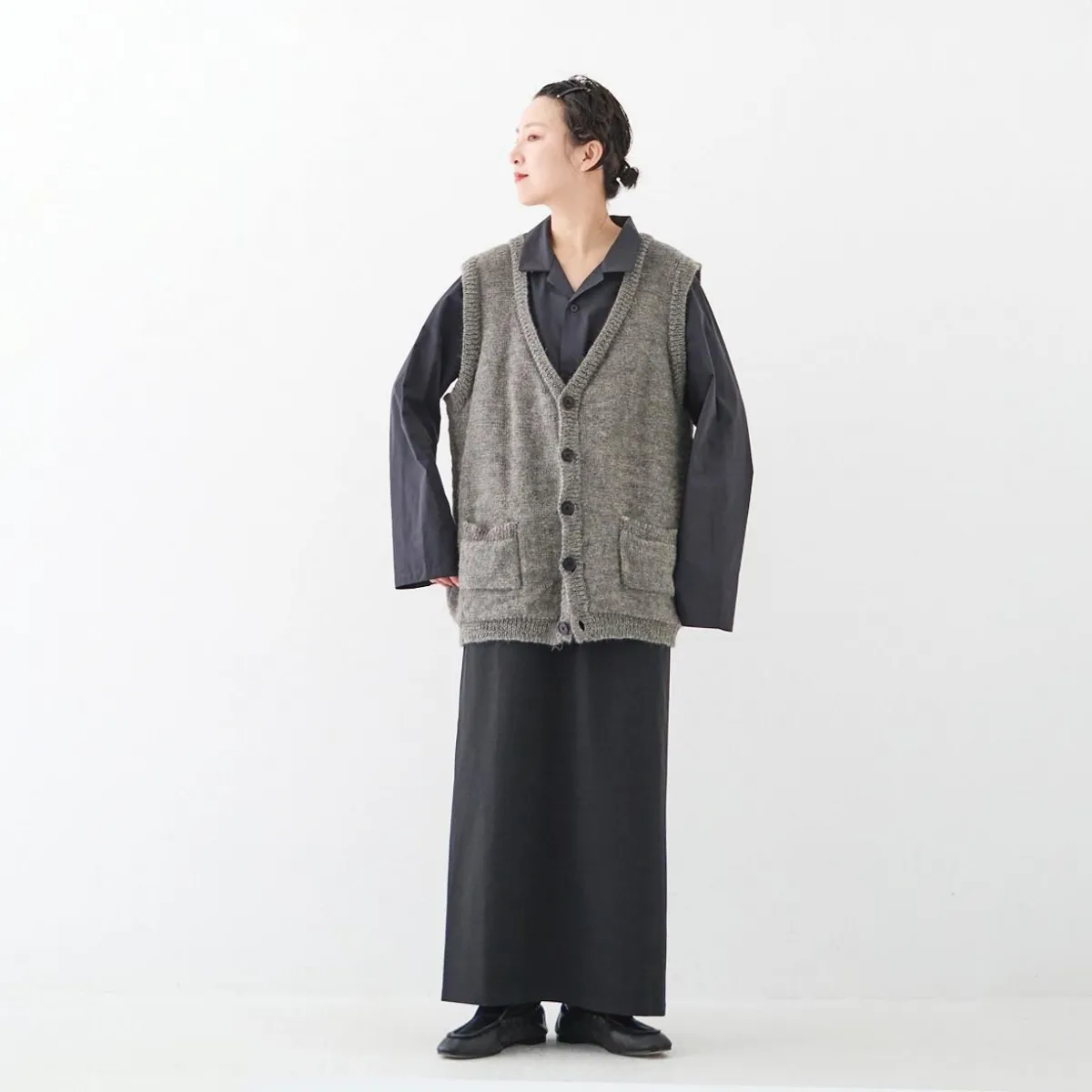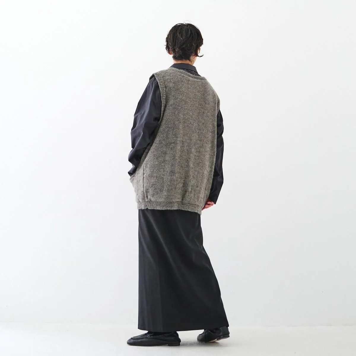 このヤエカのガンジーニットベストはその想いを継承し、密度の高い糸と、細かな編み地によって作られています。自然な風合いと無骨さが残る深みのあるグレーは男女問わず着用できる配色。オーバーサイズに作られているので、女性が着用するとお尻が隠れる程度の丈感です。野暮ったさとセンスを併せ持つ、服好きのための長く愛せる逸品です。