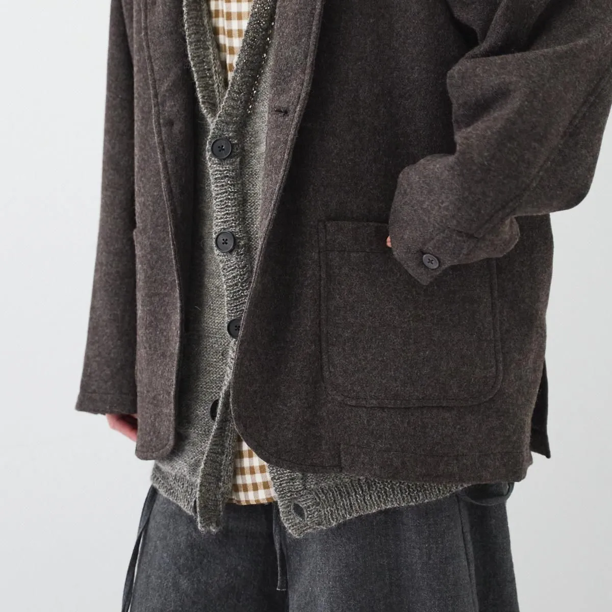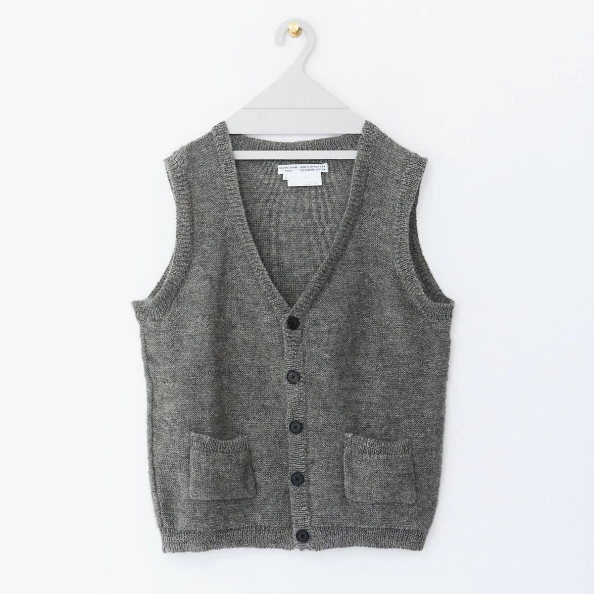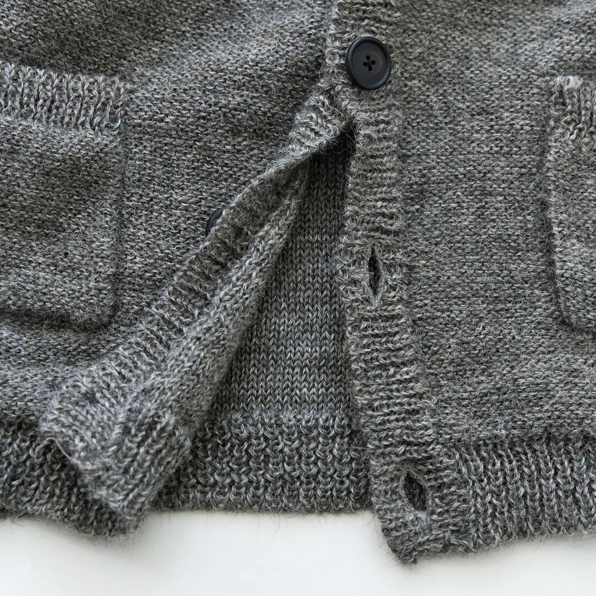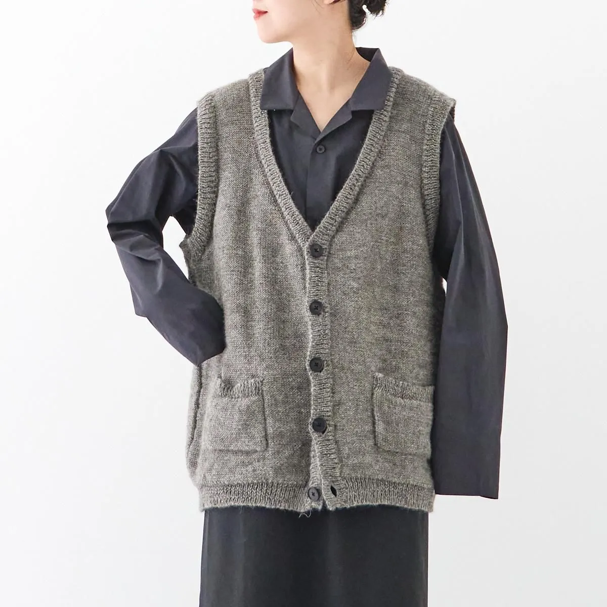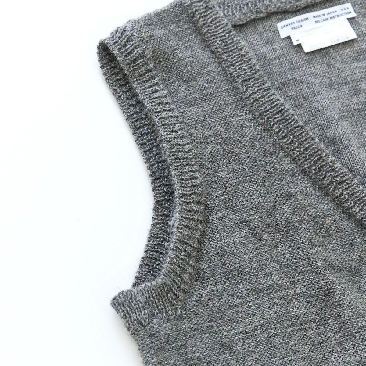 このヤエカのガンジーニットベストはその想いを継承し、密度の高い糸と、細かな編み地によって作られています。自然な風合いと無骨さが残る深みのあるグレーは男女問わず着用できる配色。オーバーサイズに作られているので、女性が着用するとお尻が隠れる程度の丈感です。野暮ったさとセンスを併せ持つ、服好きのための長く愛せる逸品です。