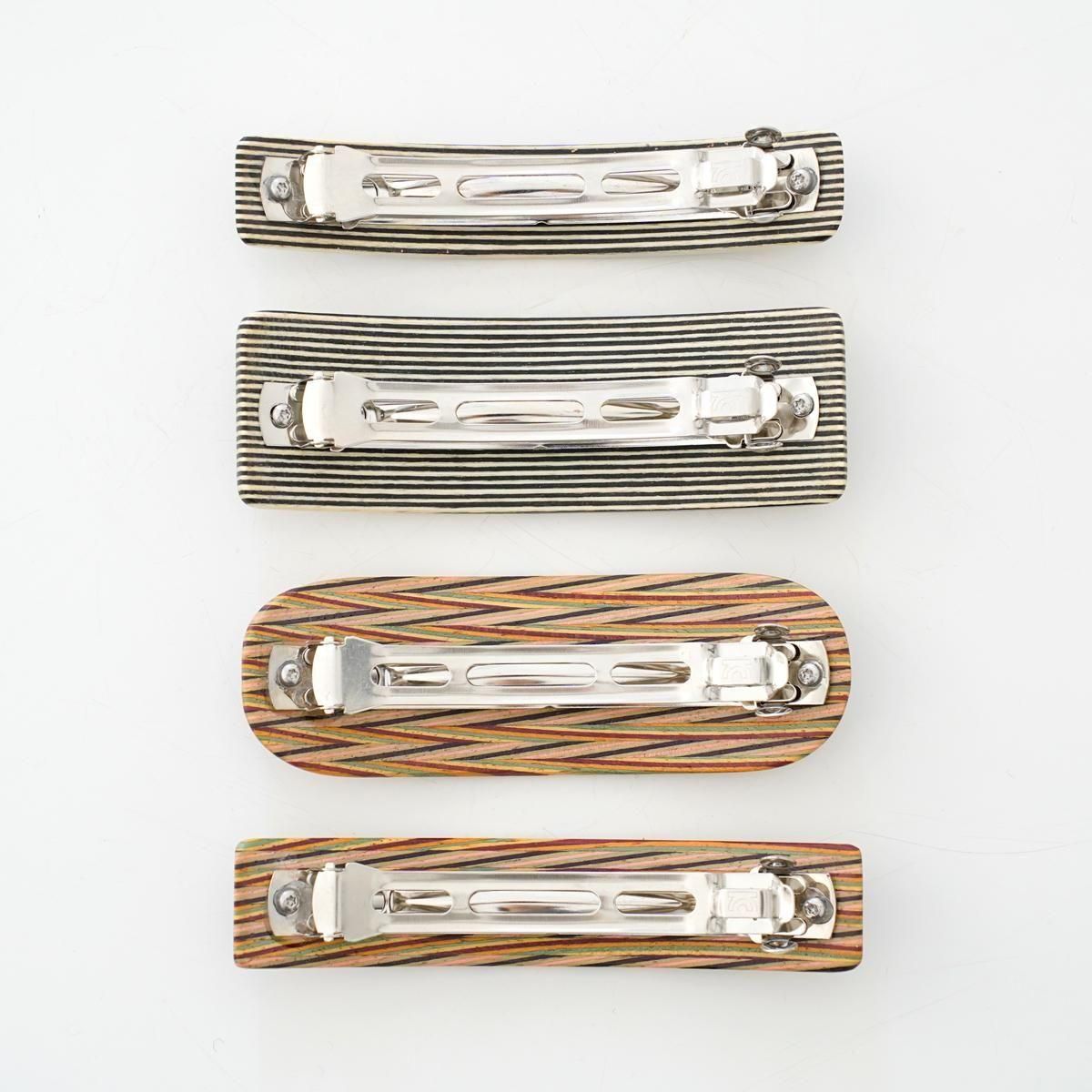 縞模様が美しいウッド素材を使用したヘアクリップです。数あるコストカムのクリップの中でも今季は一番人気のシリーズ。10cmサイズはまとめ髪に添えるだけで上品なスタイリングが完成するアイテム。異素材のクリップやスティックと合わせるのも素敵です。 (着用写真 G-1,F-1) material:WOOD size:10cm(金具部分) color:F-1・F-2・G-1・G-2 made in germany (金具はフランス製のものを用いています) ※online shopの商品は、実店舗でも販売しております。画面上で在庫がある状態になっている場合でもタイミングによっては在庫切れの場合もございます。予めご了承下さい。 お取り扱い店舗・・・dieci kyutaro店2F ------------------------------------------------------- KOSTKAMM|コストカム ドイツのブランド KOSTKAMM(コストカム)。19世紀中頃より動物の骨や、木などの天然素材を使って櫛やアクセサリーを手作業で作り続けています。天然素材の櫛やブラシはプラスチックとは違い、髪に背電気を帯ず頭皮に優しいという事から、現在ではドイツのオーガニック製品を扱うお店などに置かれるとともに美容のスペシャリスト達にも広く愛用されています。