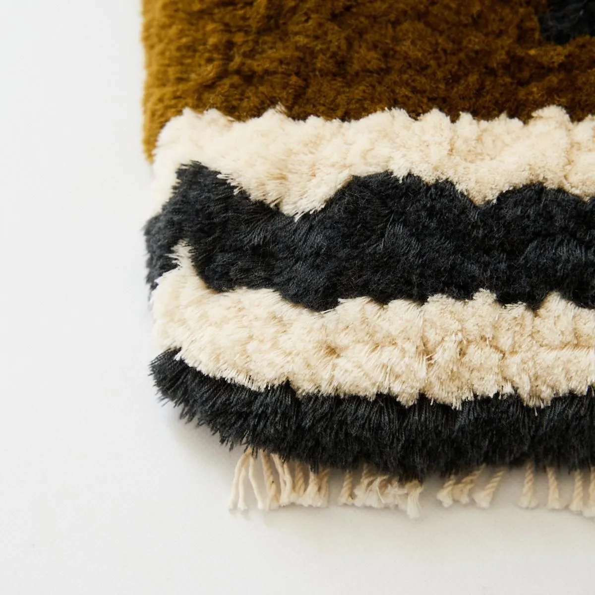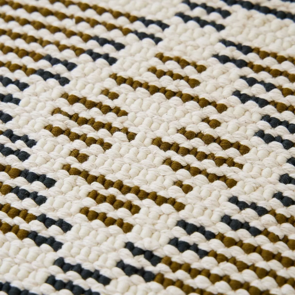倉敷本染手織研究所をご卒業された上田美晴さんが織りあげる、ノッティングの椅子敷きです。 こちらはアメリカン・インディアン、ナバホ族のモチーフをもとに上田美晴さんが織りなすdieciオリジナル別注の絵柄シリーズです。 細やかな技術と洗練された配色がとても美しい上田織物のノッティングは糸選びから色染めやデザイン、仕上げまでの全ての工程を、上田美晴さんお一人で行っています。 ご自身の求める色や柄に仕上げるために、使用する糸選びも厳選し、独自の世界観を織りなした品は、丁寧な手仕事が伝わってきます。 ノッティングとは、径に木綿糸を張り、ウールもしくは木綿の糸束を結び(ノッティング)つけて制作されたものです。 こちらは、ナバホ族の伝統的な幾何学模様を、ほんのりグリーンがかったライトブラウンを基調に表現した椅子敷です。白と深みのある青で描かれた模様がアクセントになっています。 size:約 32cm × 32cm(脇の結び糸含まず/サイズは個体差がございます) material:ウール , コットン 取扱い店舗・・・dieci kyutaro店 1F
